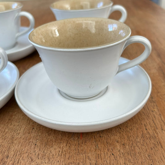 Denby style modern cup and saucer set of 4 - retro rustic farmhouse style - White with speckled beige inside
