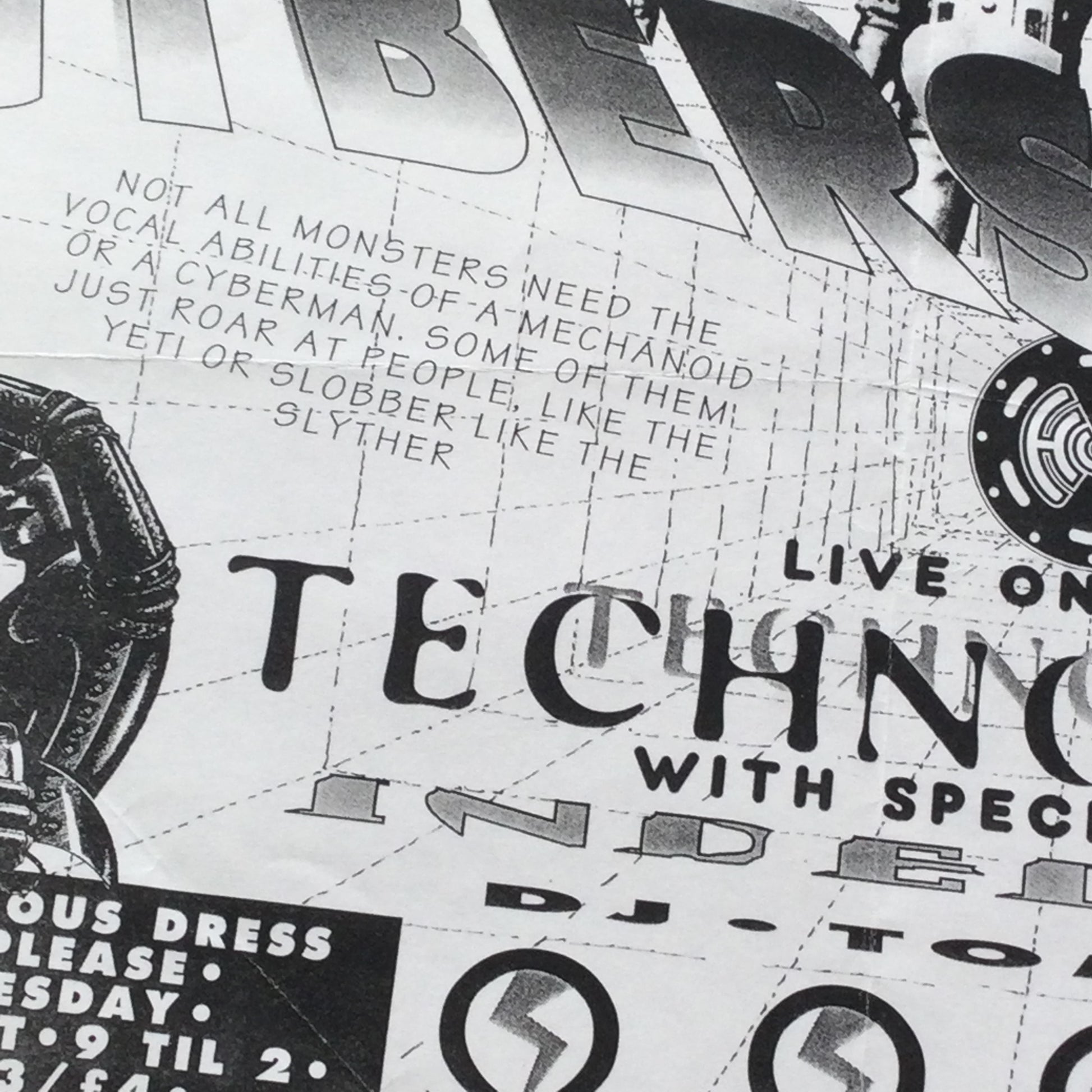 Great photocopied flyer from the 1990s, probably 1995. It says 'Not all monsters need the vocal abilities of a mechanoid or a cyberman. Some of them just roar at people, like the Yeti, or slobber like the Slyther.