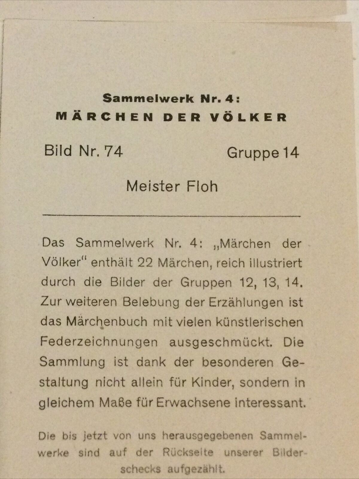 Printed in 1933, when Hitler was first coming to power. This series showed international folk tales, which were later discontinued and just German folk tales shown, to fit in with Hitlers agenda.