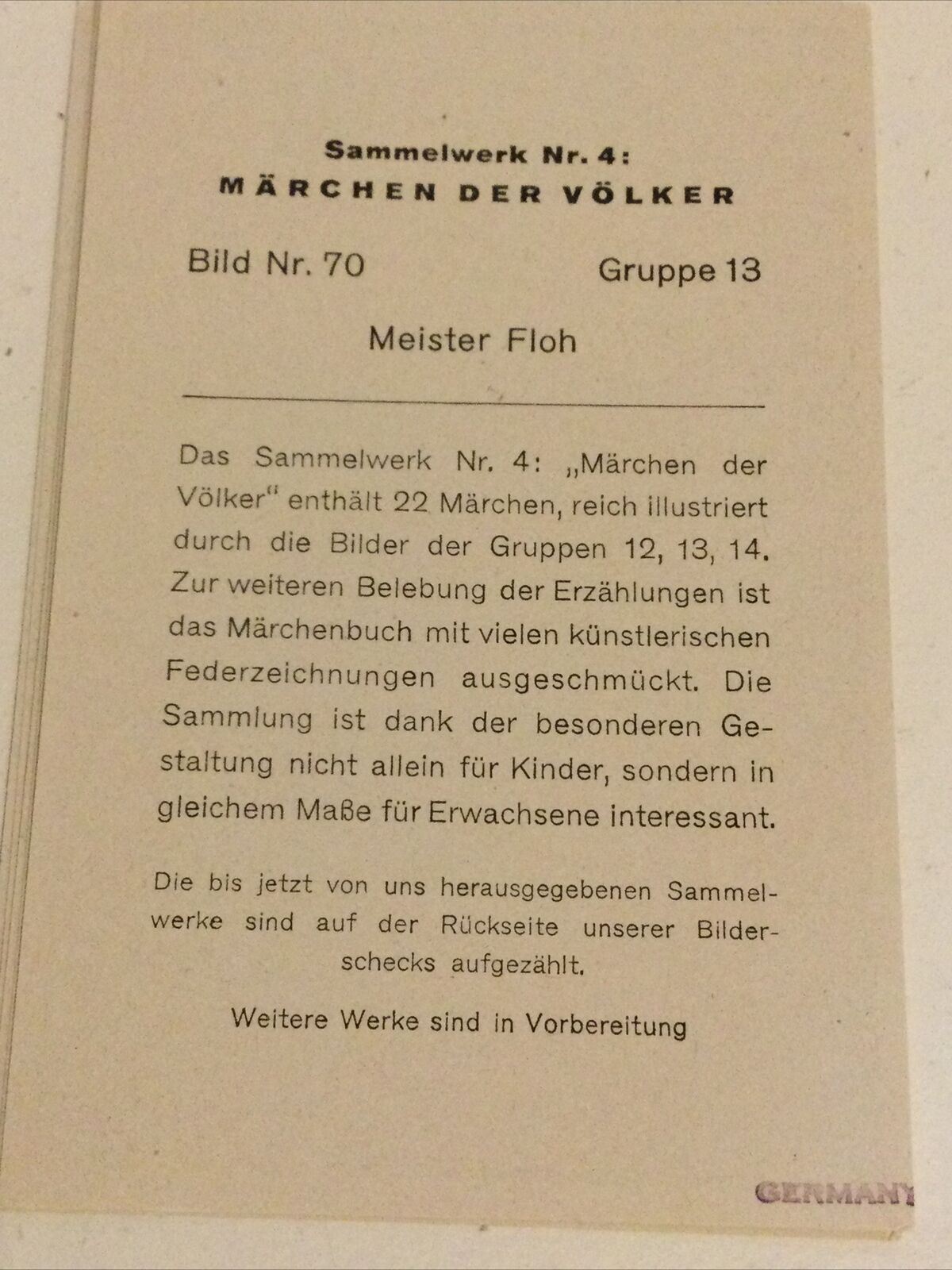 Printed in 1933, when Hitler was first coming to power. This series showed international folk tales, which were later discontinued and just German folk tales shown, to fit in with Hitlers agenda.