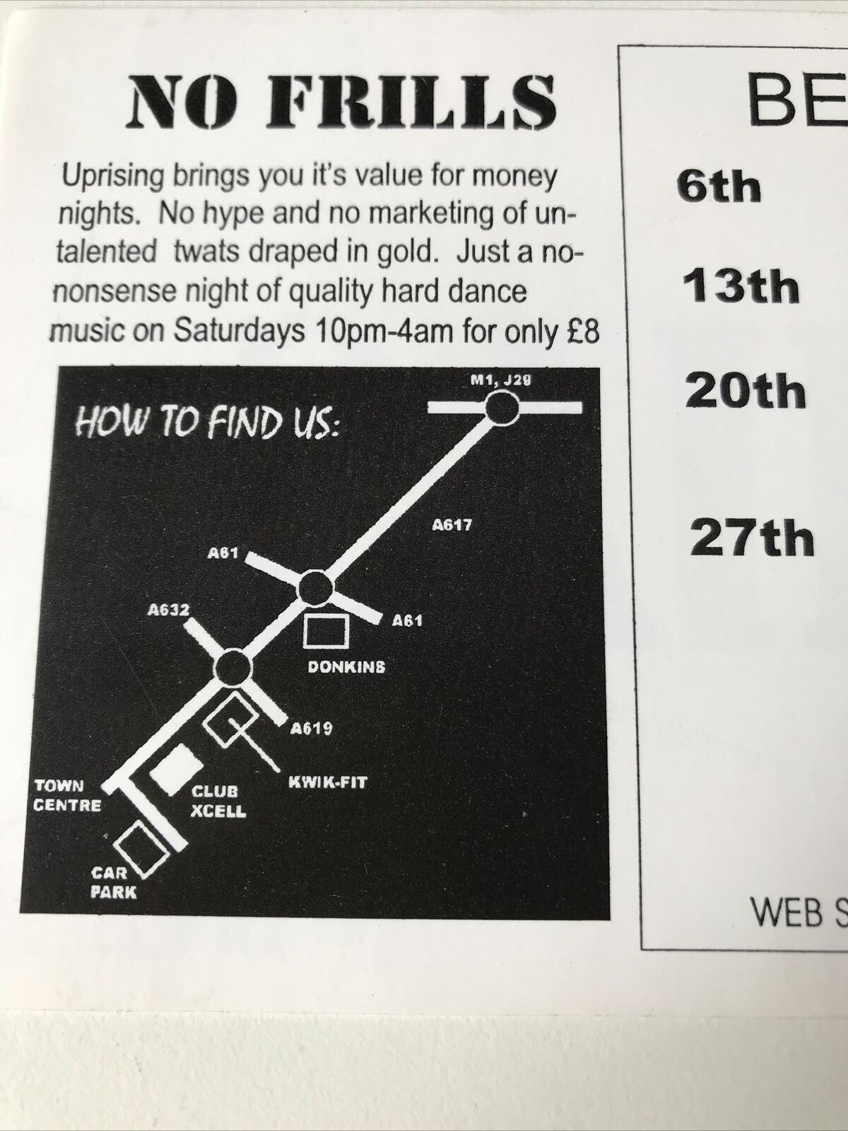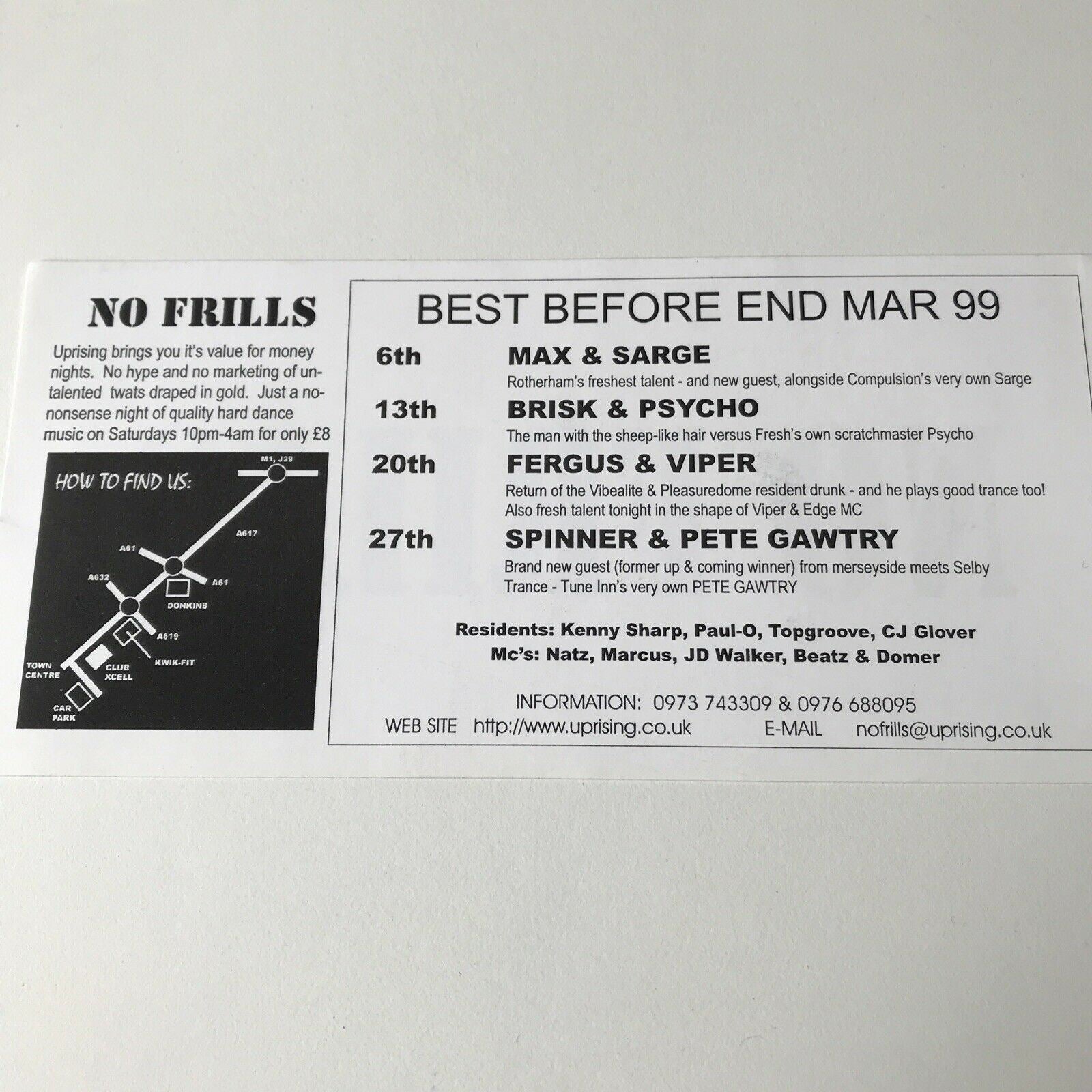 90s Y2K RAVE MEMORABILIA UPRISING March 1999 NO FRILLS CLUB XCELL CHESTERFIELD