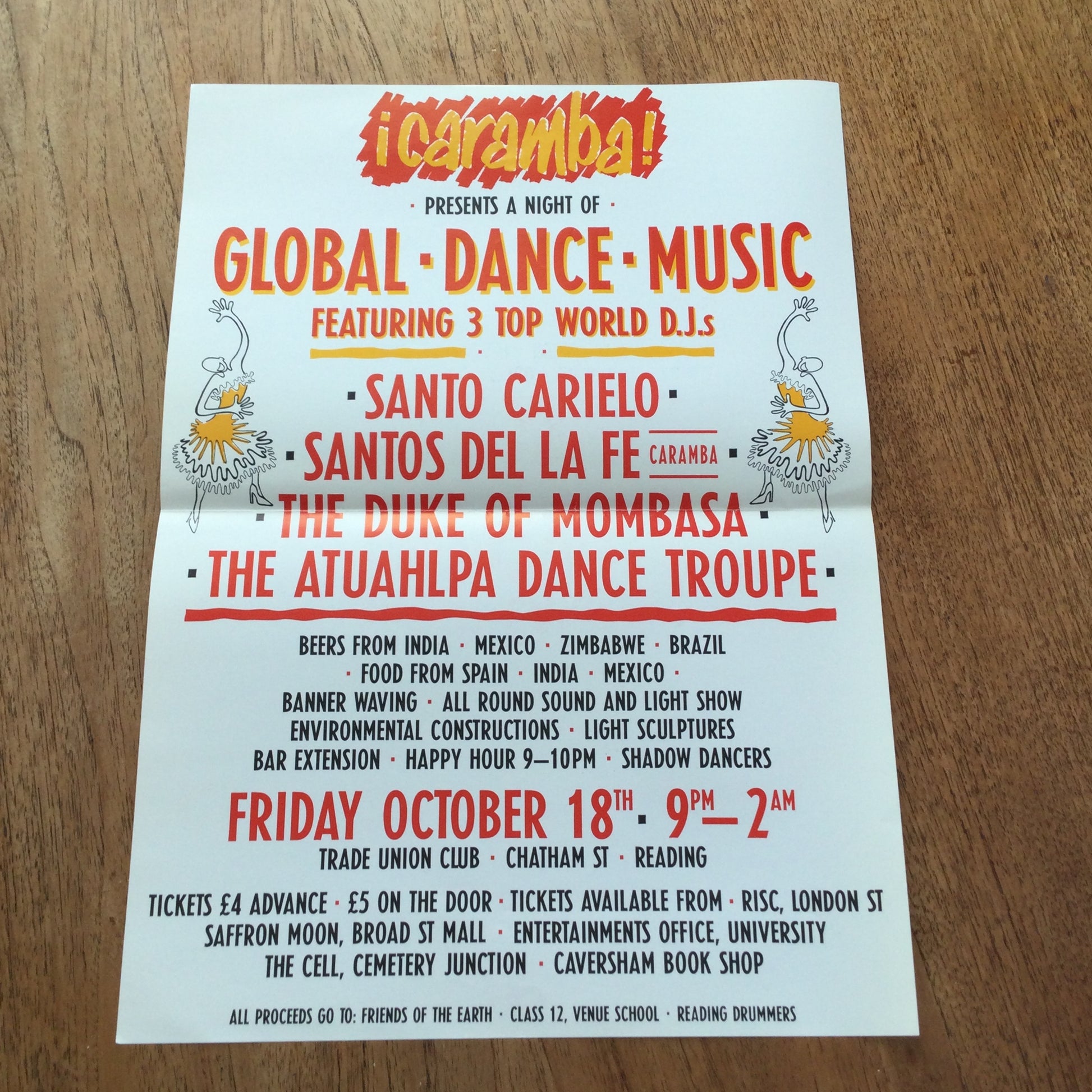 A3 Poster 1990s. Caramba Global Dance Music, Reading. Santo Carielo, Santos de la Fe, Duke of Mombasa