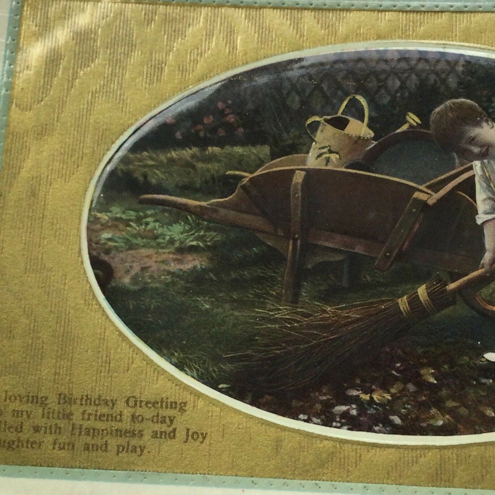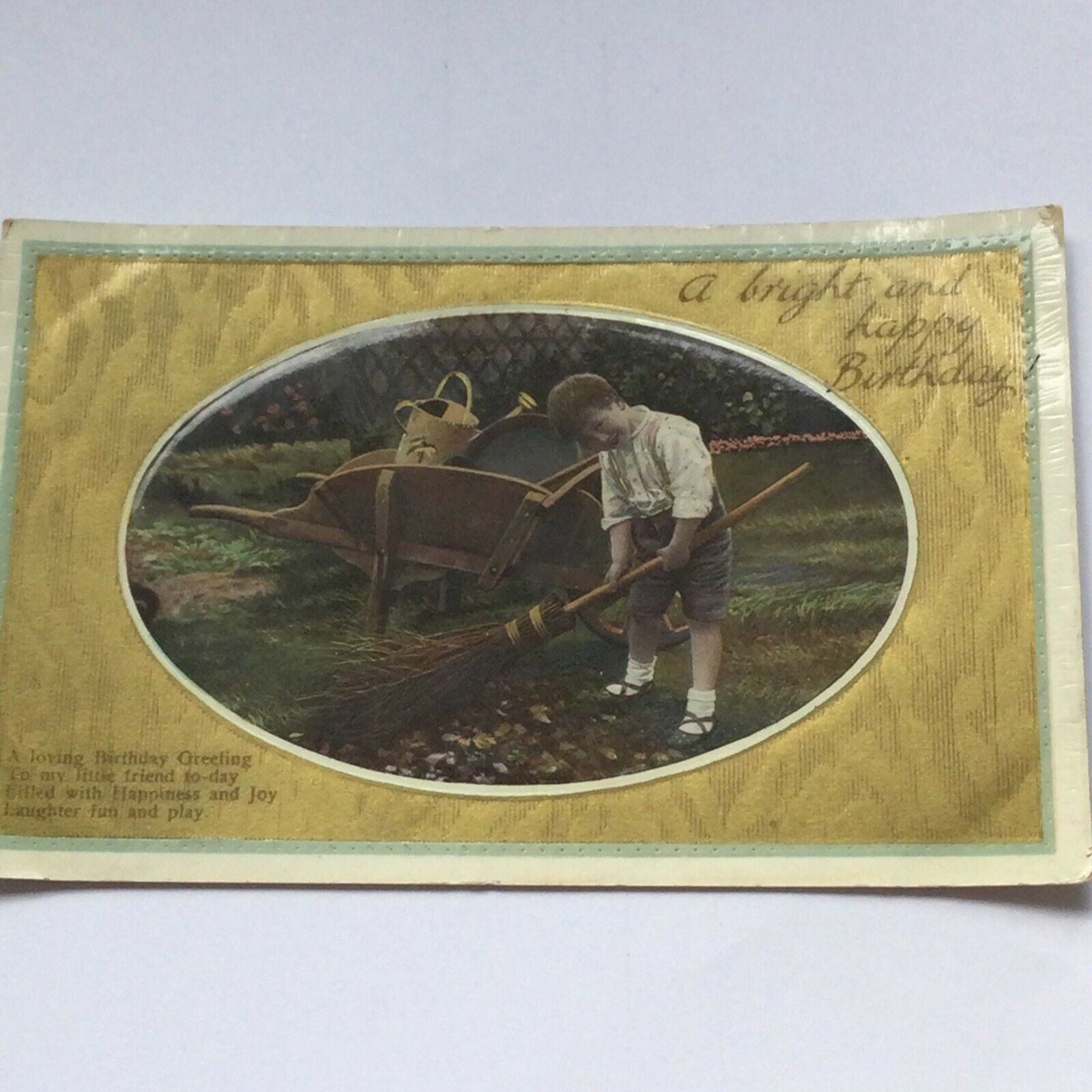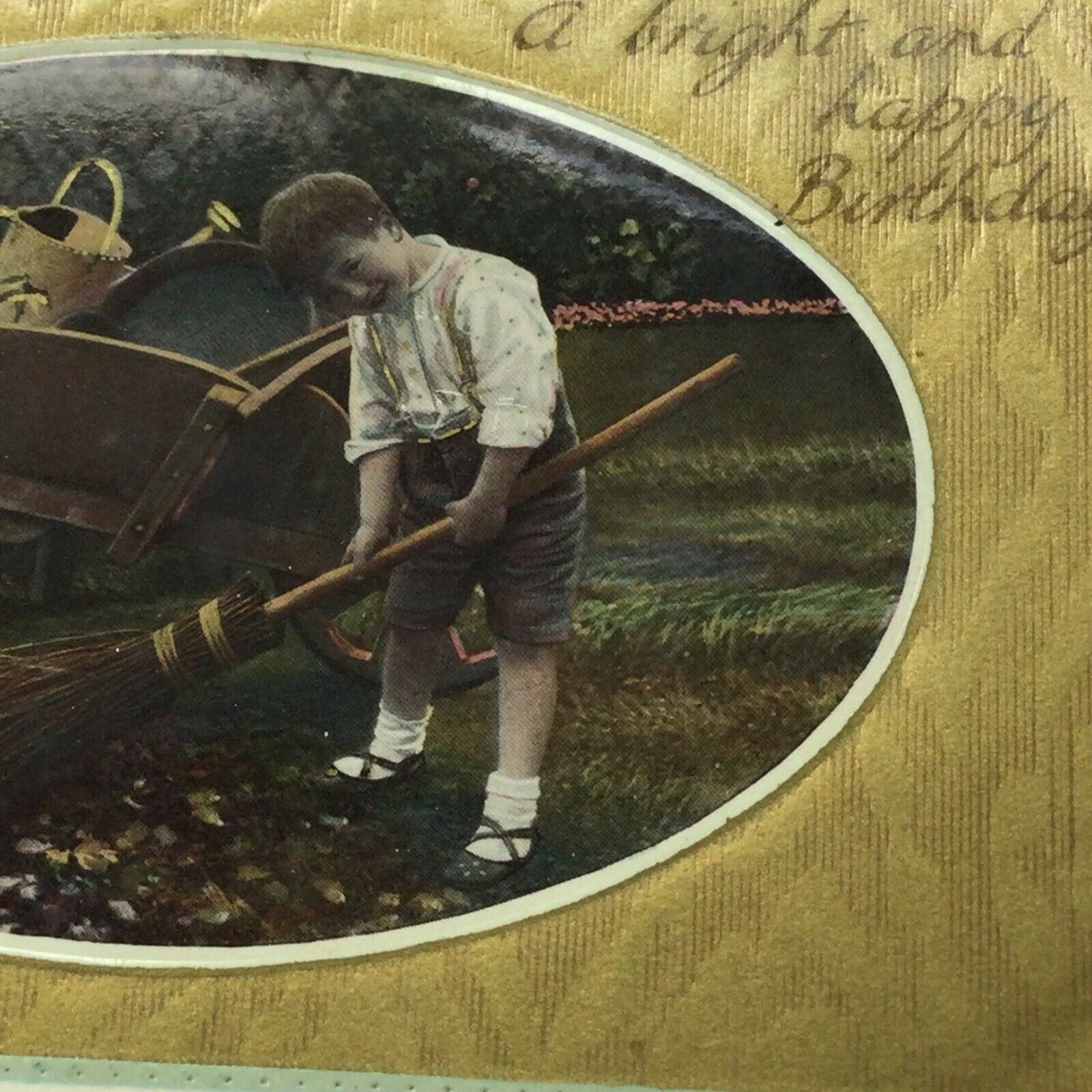 Antique 1900s Birthday Postcard Boy Sweeping Leaves Gardening Nice Poem Embossed