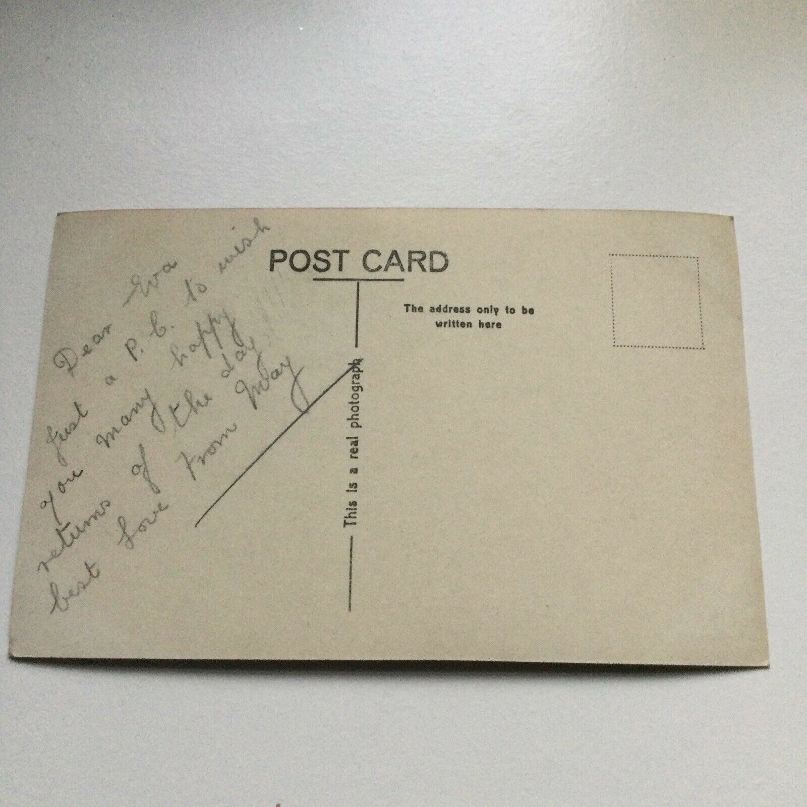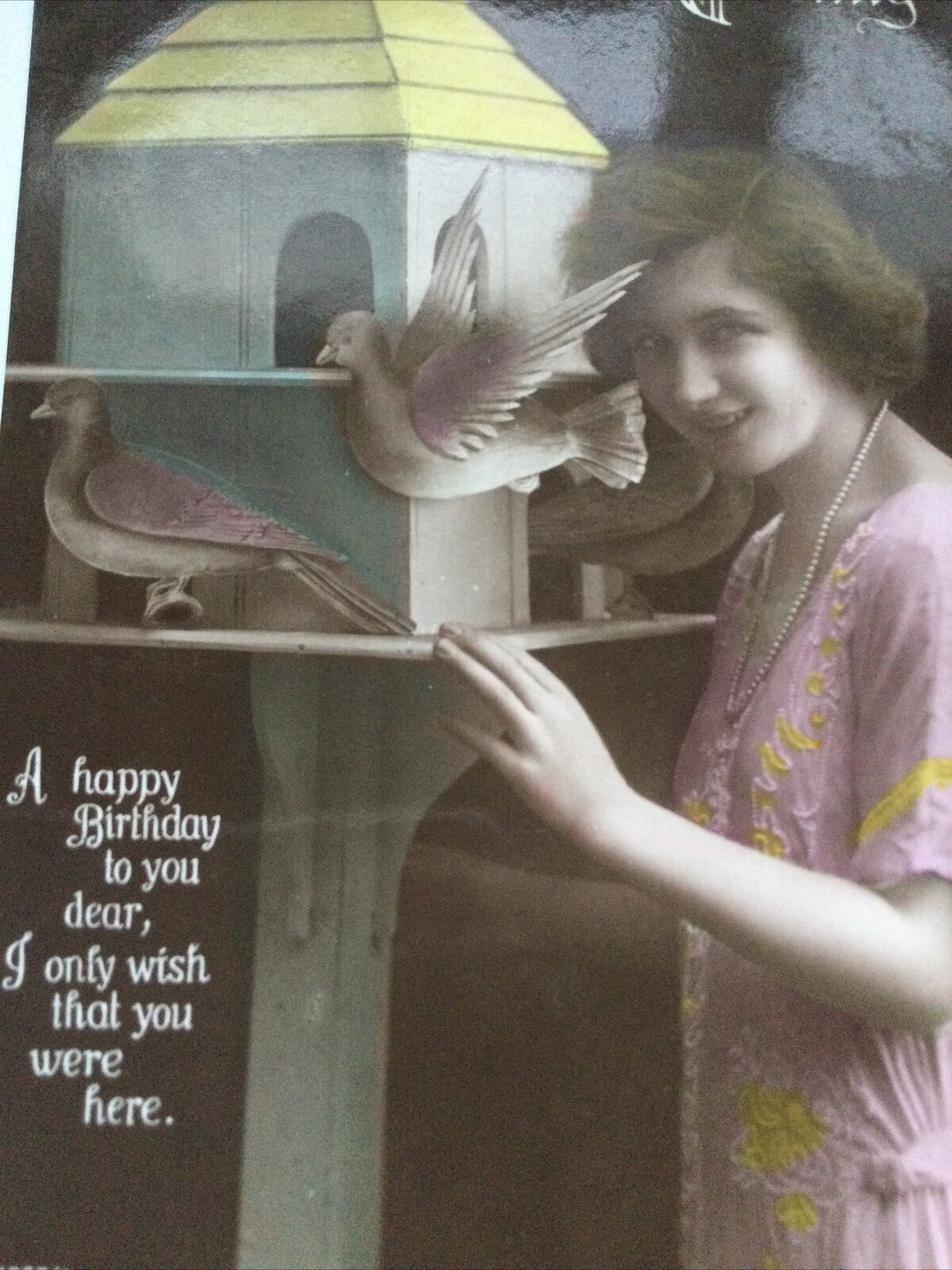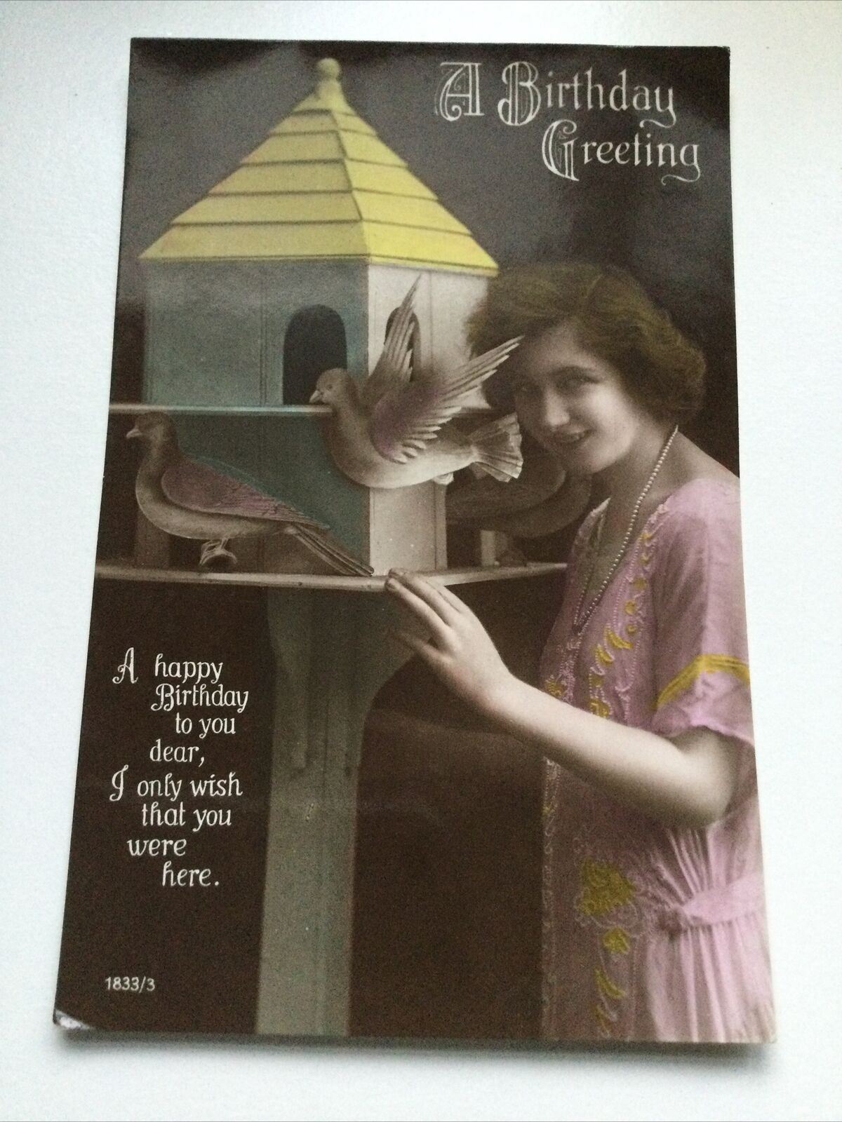 Antique Birthday Greetings Postcard Girl With Doves RP Sepia Tinted Nice Poem