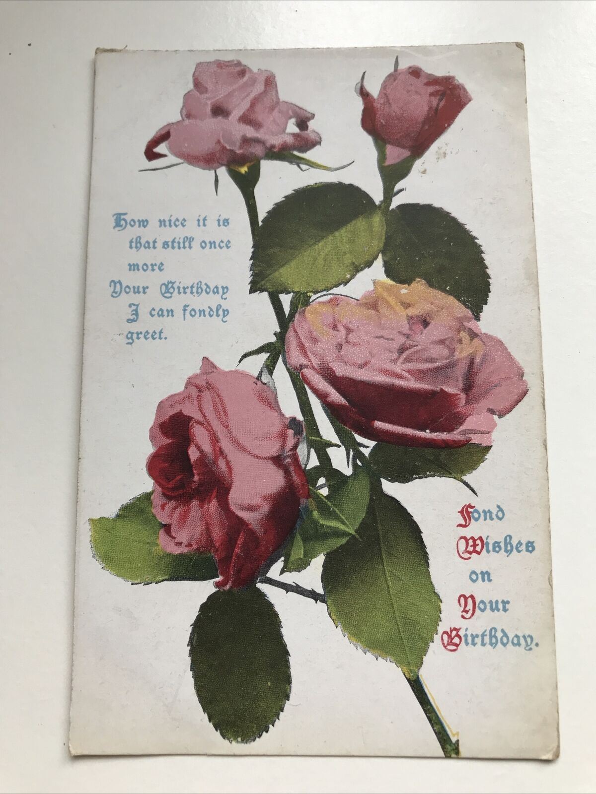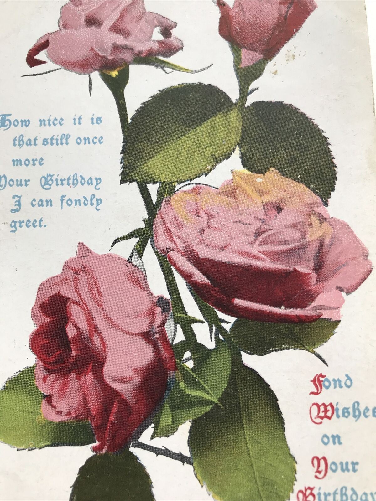 Antique Birthday Greetings Postcard Pink Roses Lovely Poem Posted