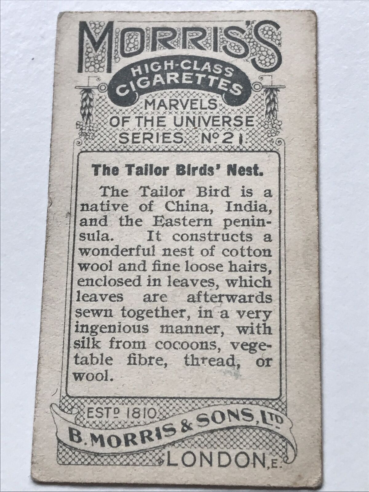 Antique CIGARETTE CARD TAILOR BIRDS’ NEST Morris’s Marvels Of The Universe #21