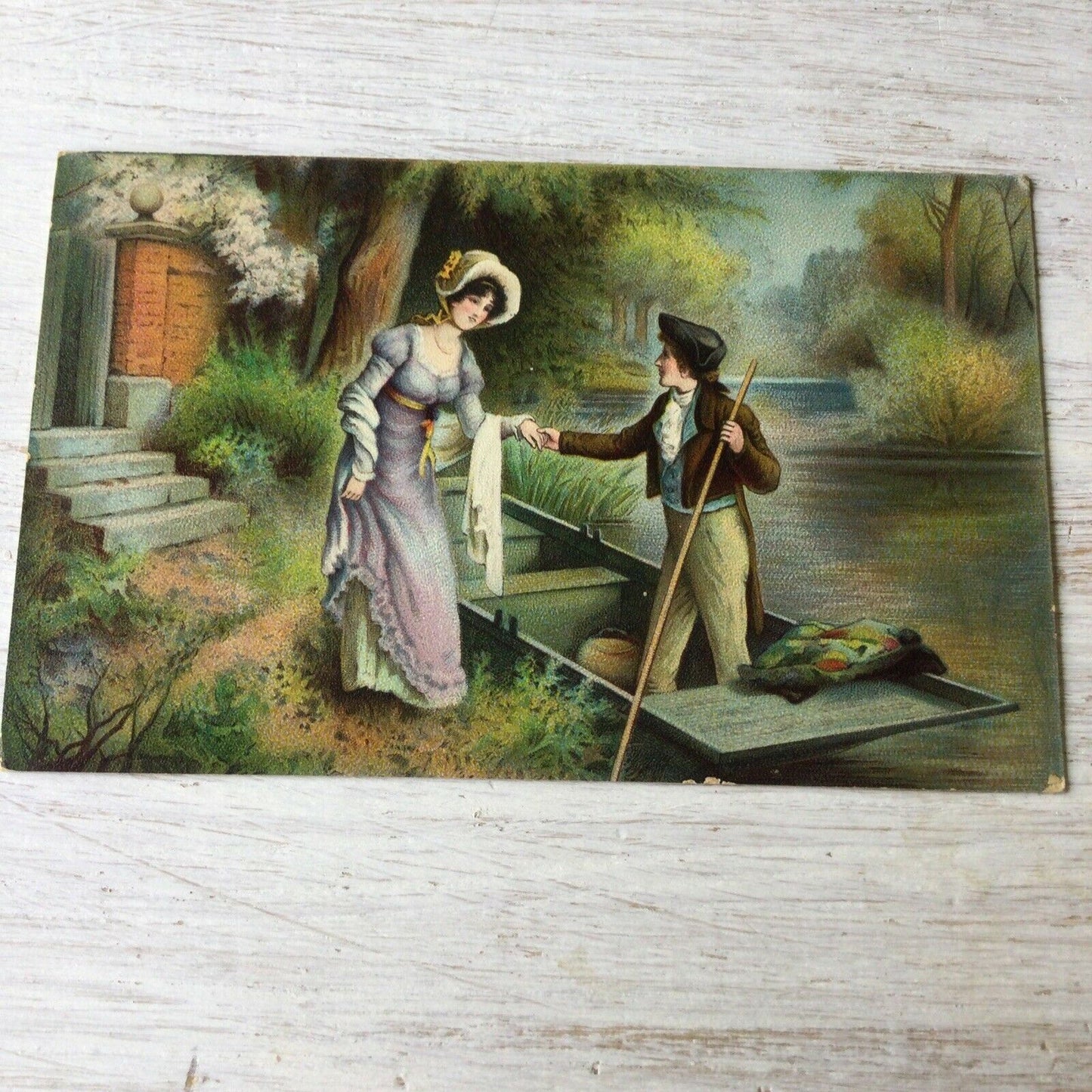 Antique Edwardian Postcard 1907 Coloured Picture. Man & Woman Punting River Scen