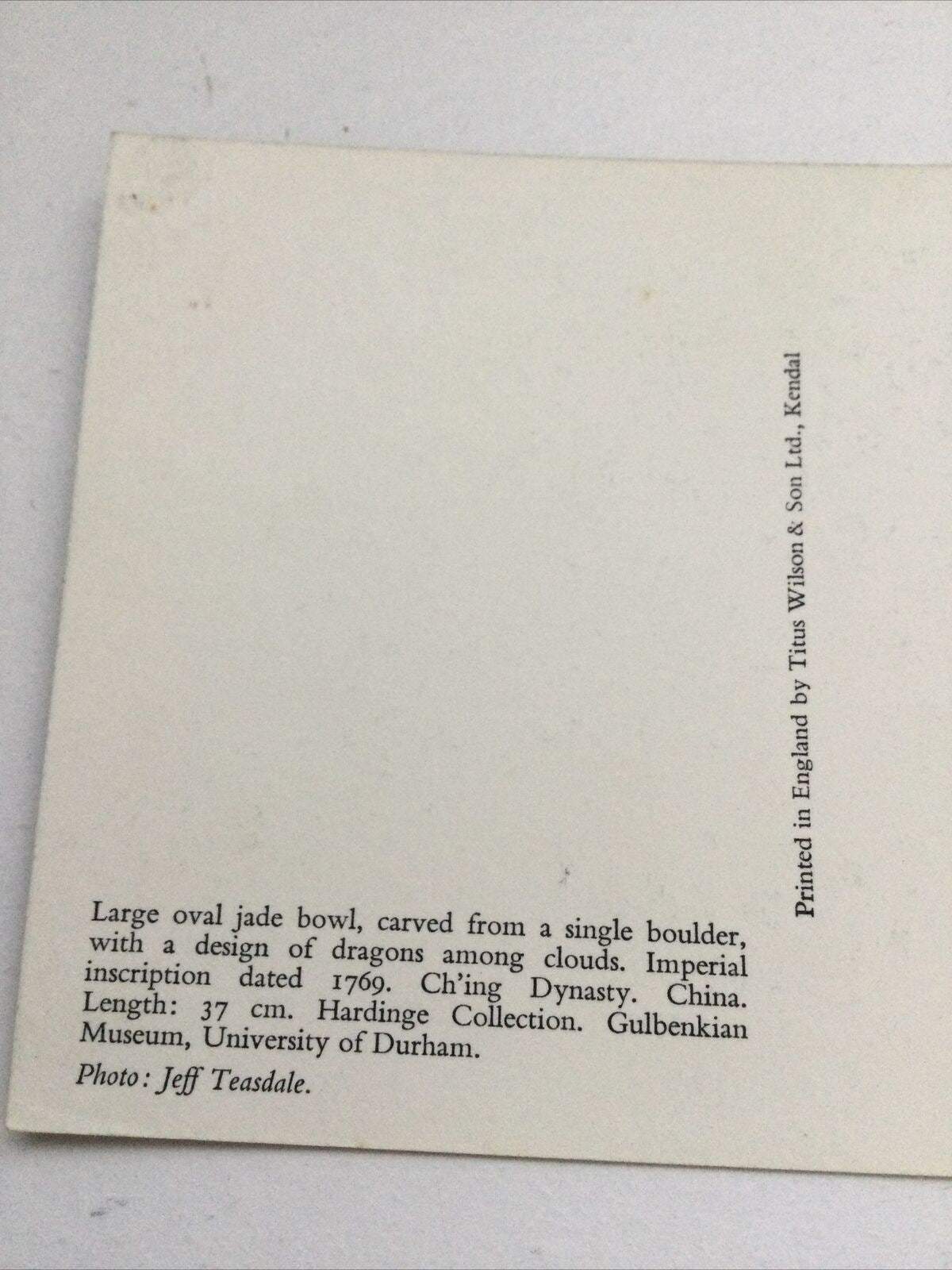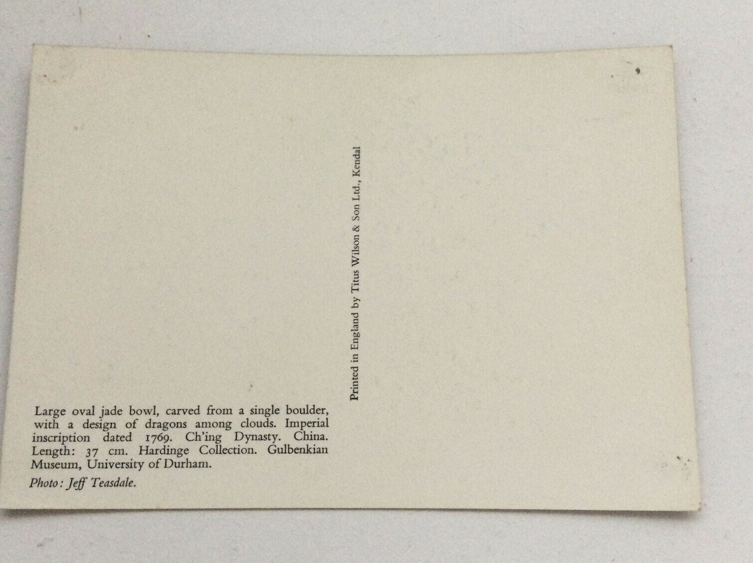 Art Postcard Ch’ing Dynasty China Large Oval Jade Bowl. Gulbenkian Museum 1769. Condition is "Used". Dispatched with Royal Mail 2nd Class Letter.