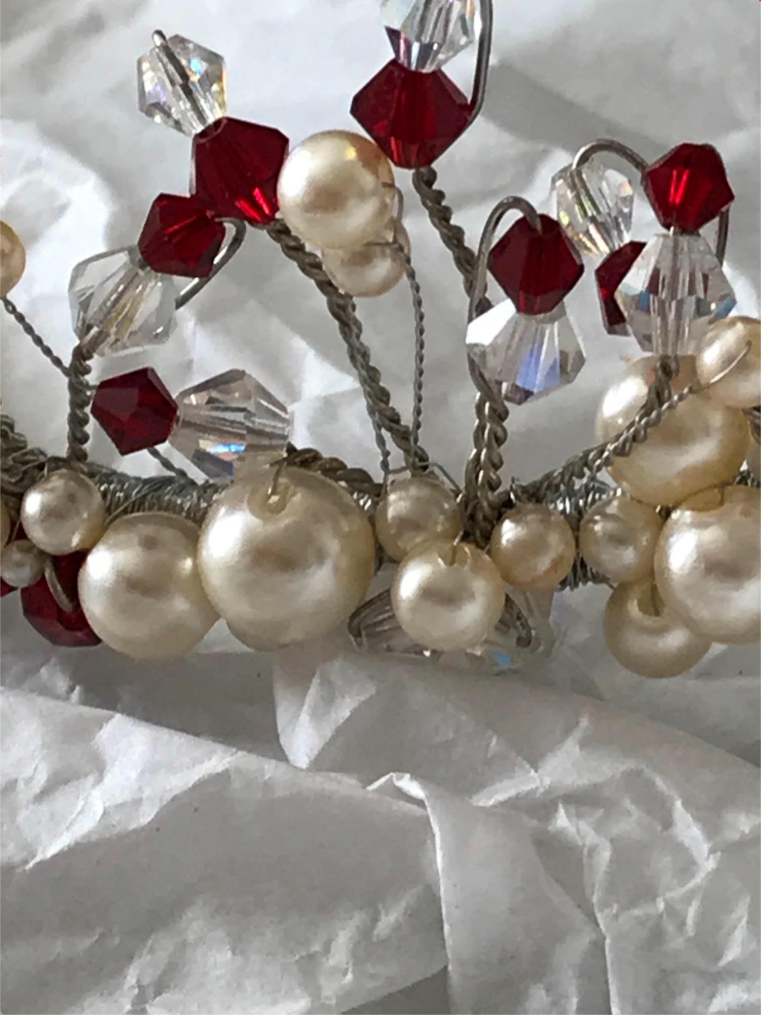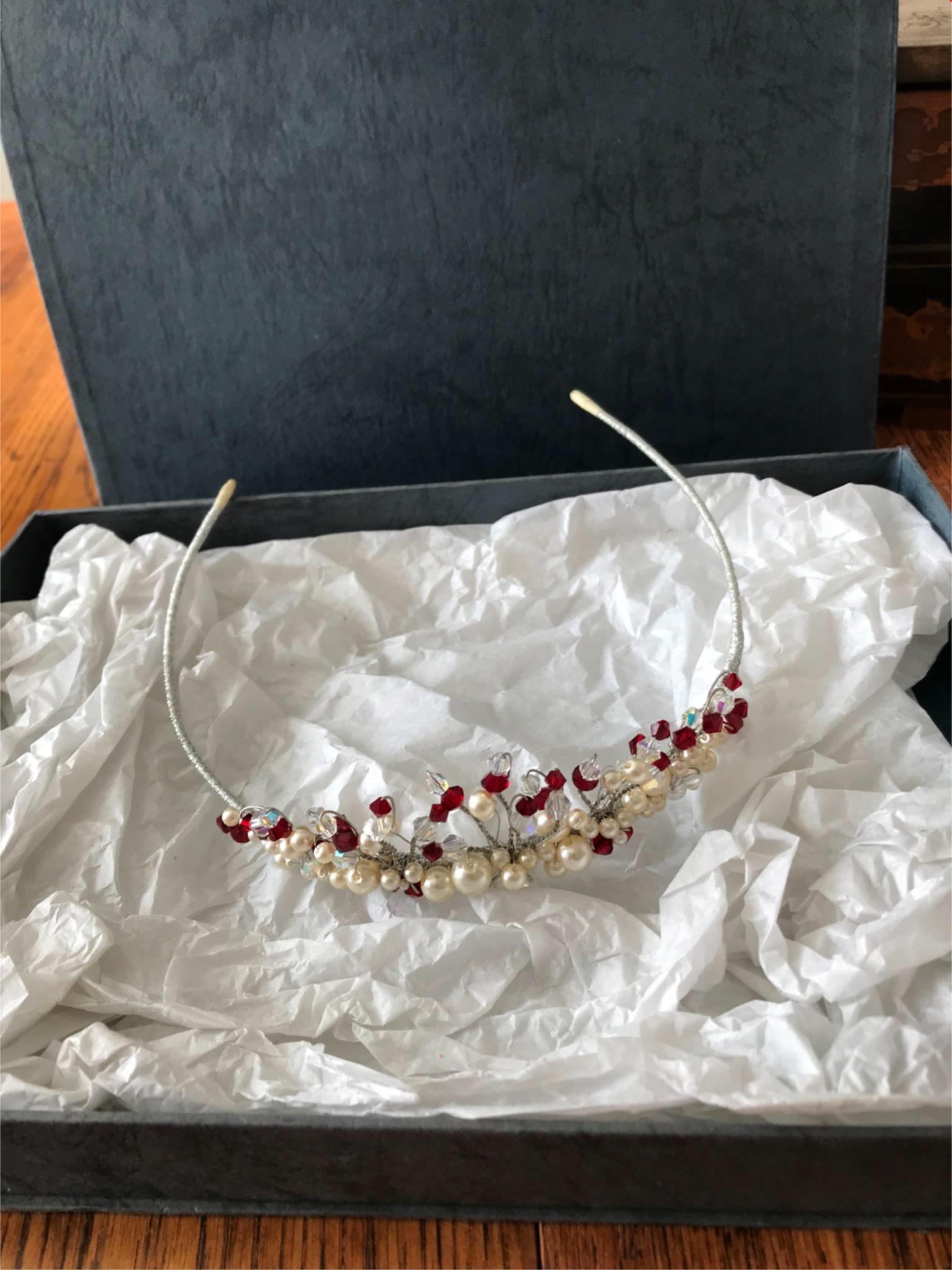 Beautiful winter wedding tiara. Simulate pearls and red beads. Silver tone wire.