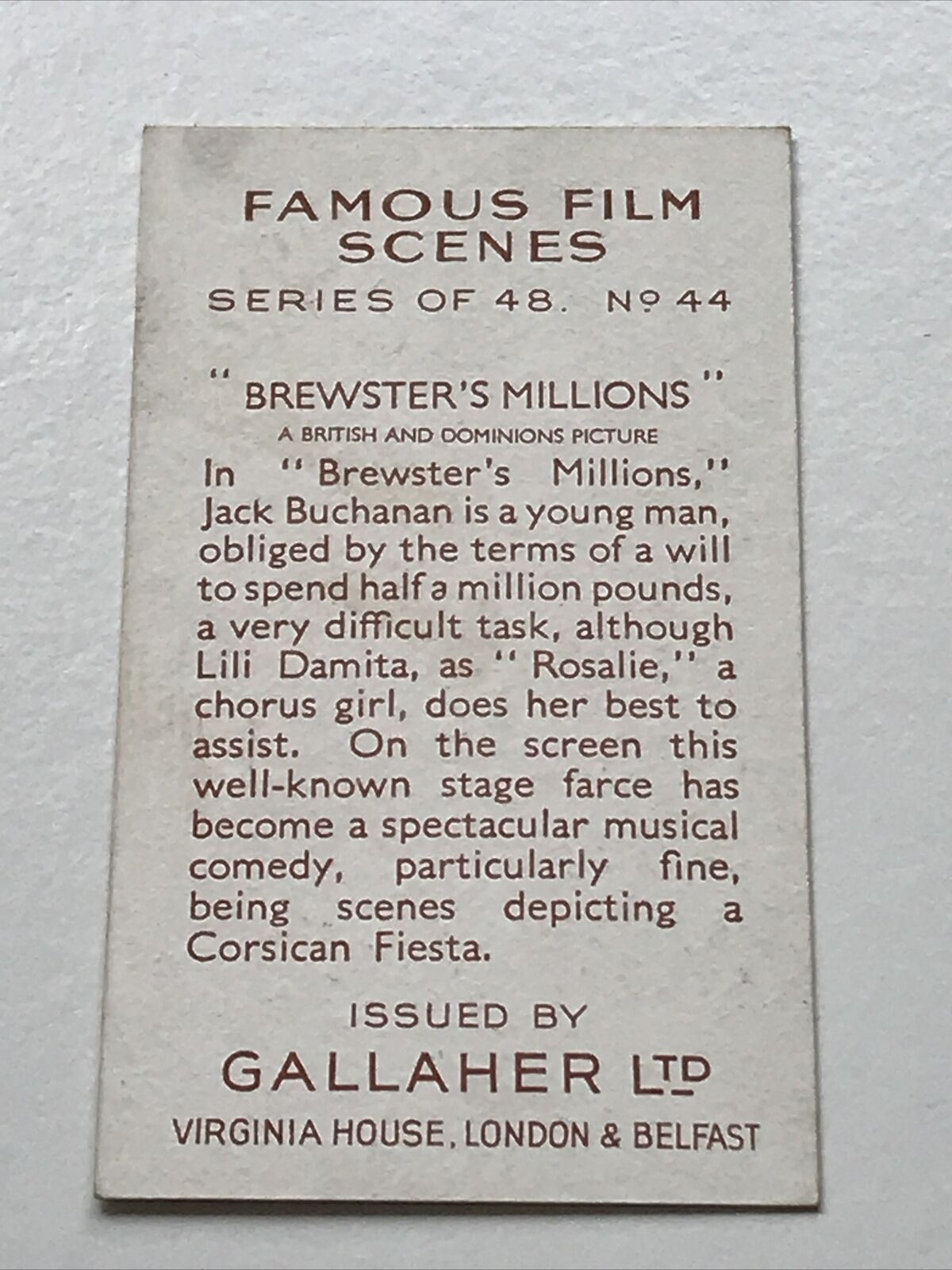 Brewster’s Millions MOVIE MEMORABILIA. Cigarette Card Gallaher Famous Film Scene