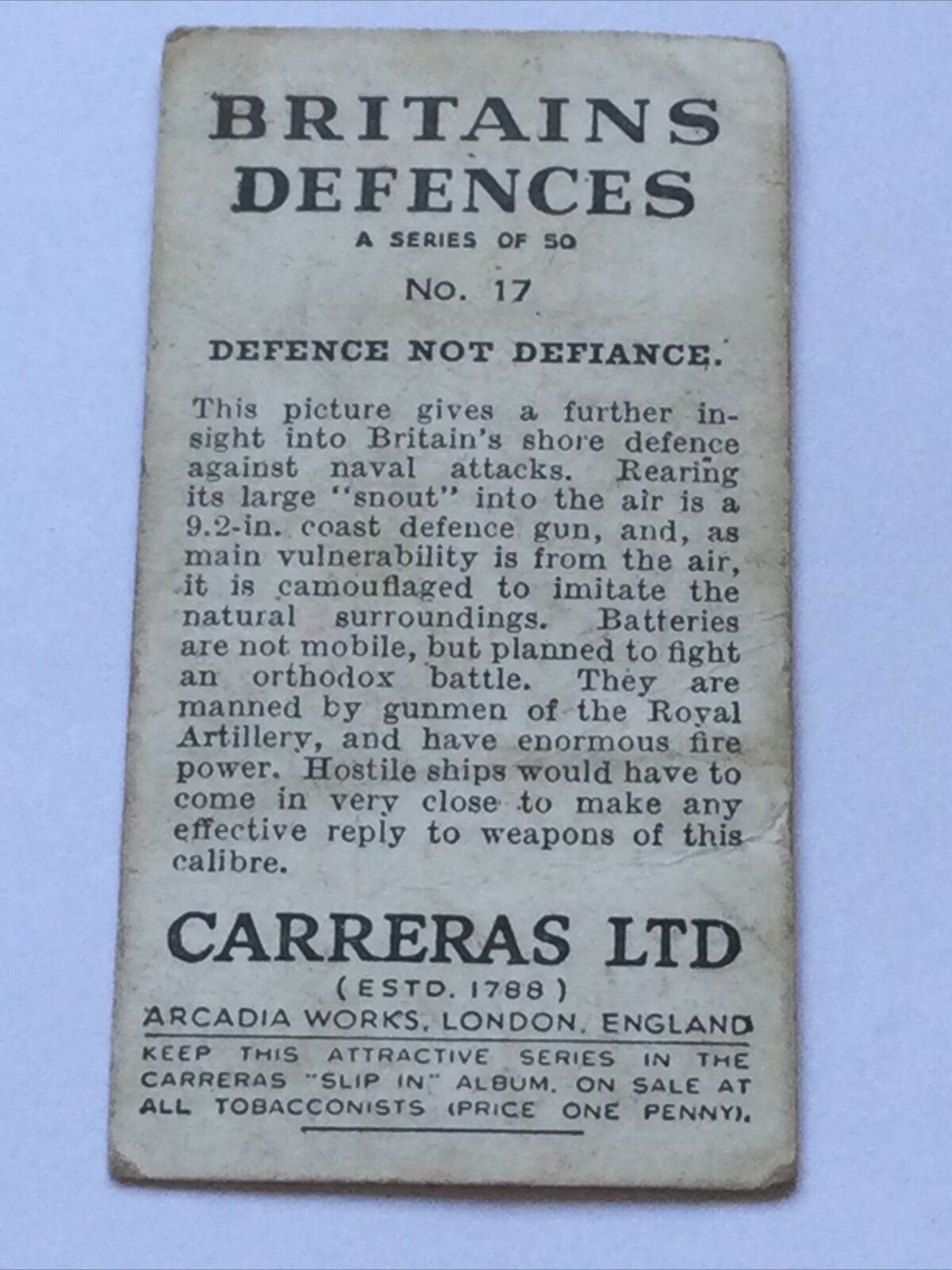 BRITAINS DEFENCES Carreras Cigarette Card #17 Defence Not Defiance Coast Gun