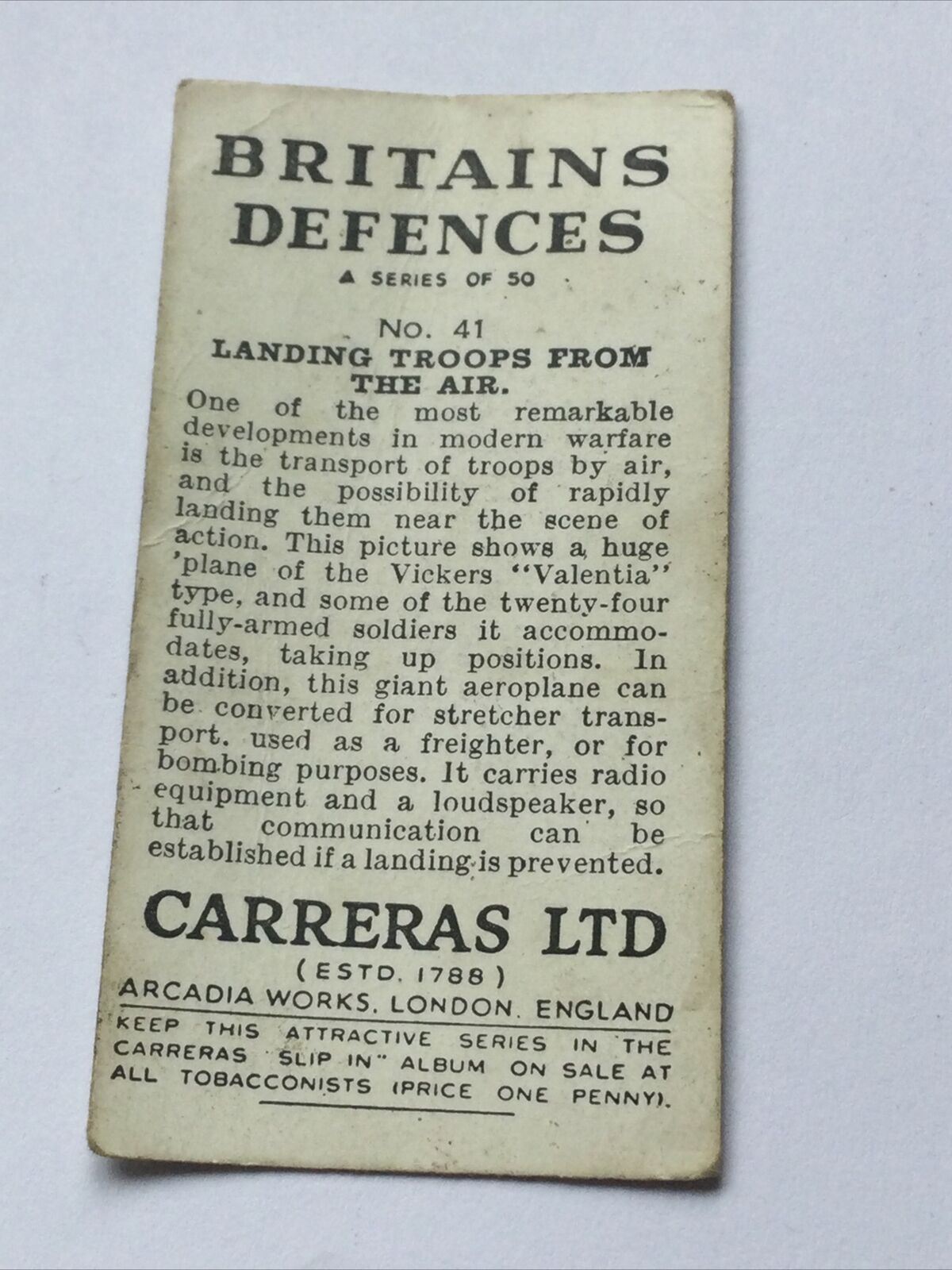BRITAINS DEFENCES Carreras Cigarette Card #41 Landing Troops From The Air Vicker