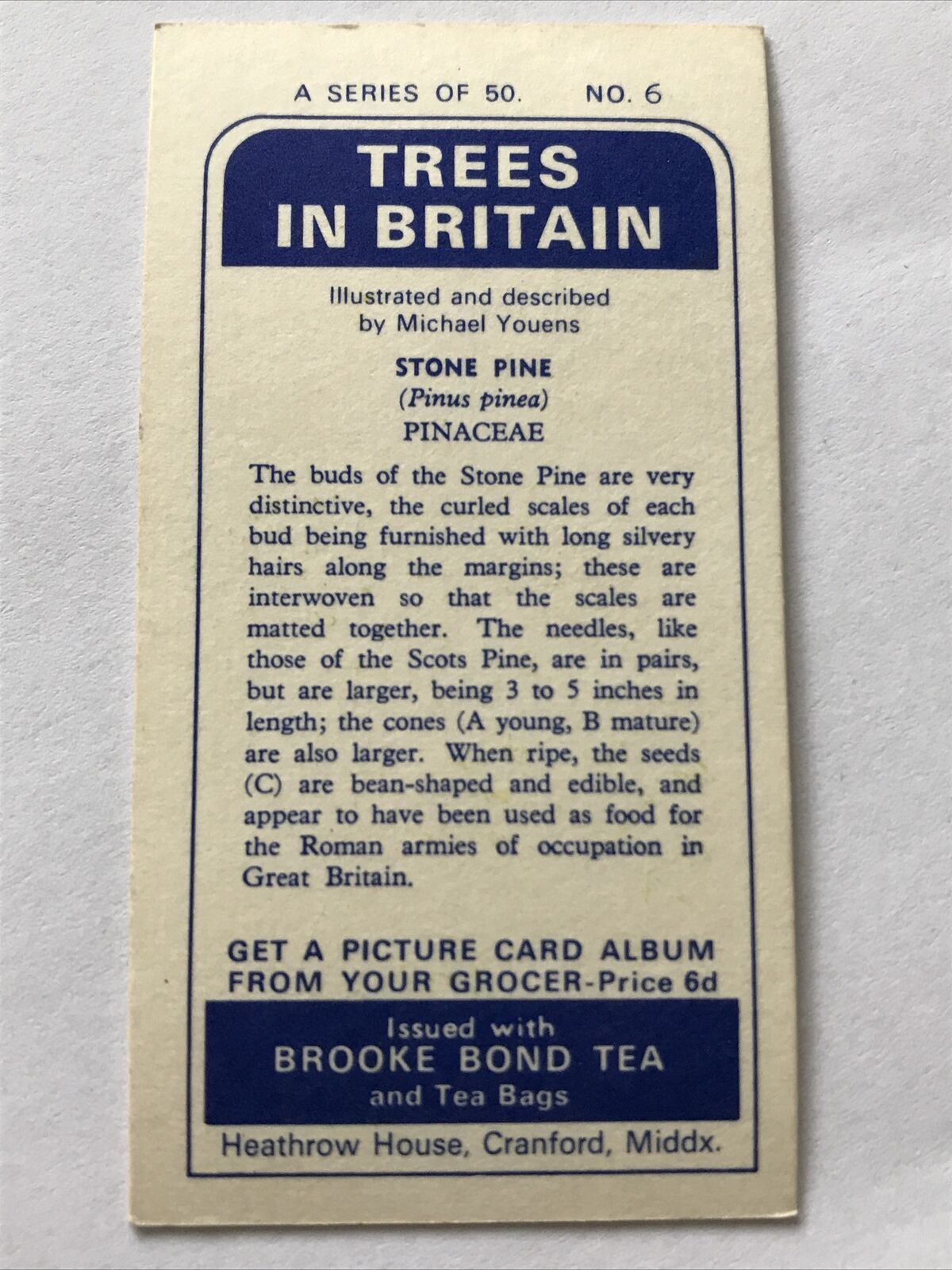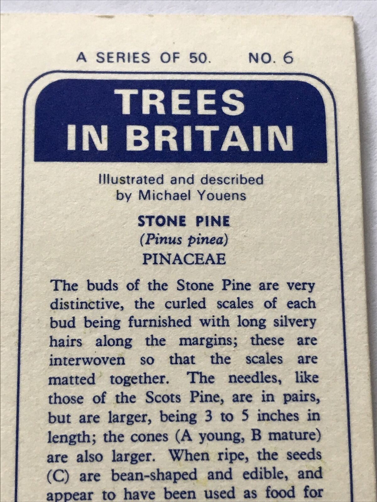 Brooke Bond Tea Card Trees In Britain No. 6 Stone Pine. Condition is "Used". Dispatched with Royal Mail 2nd Class Letter.