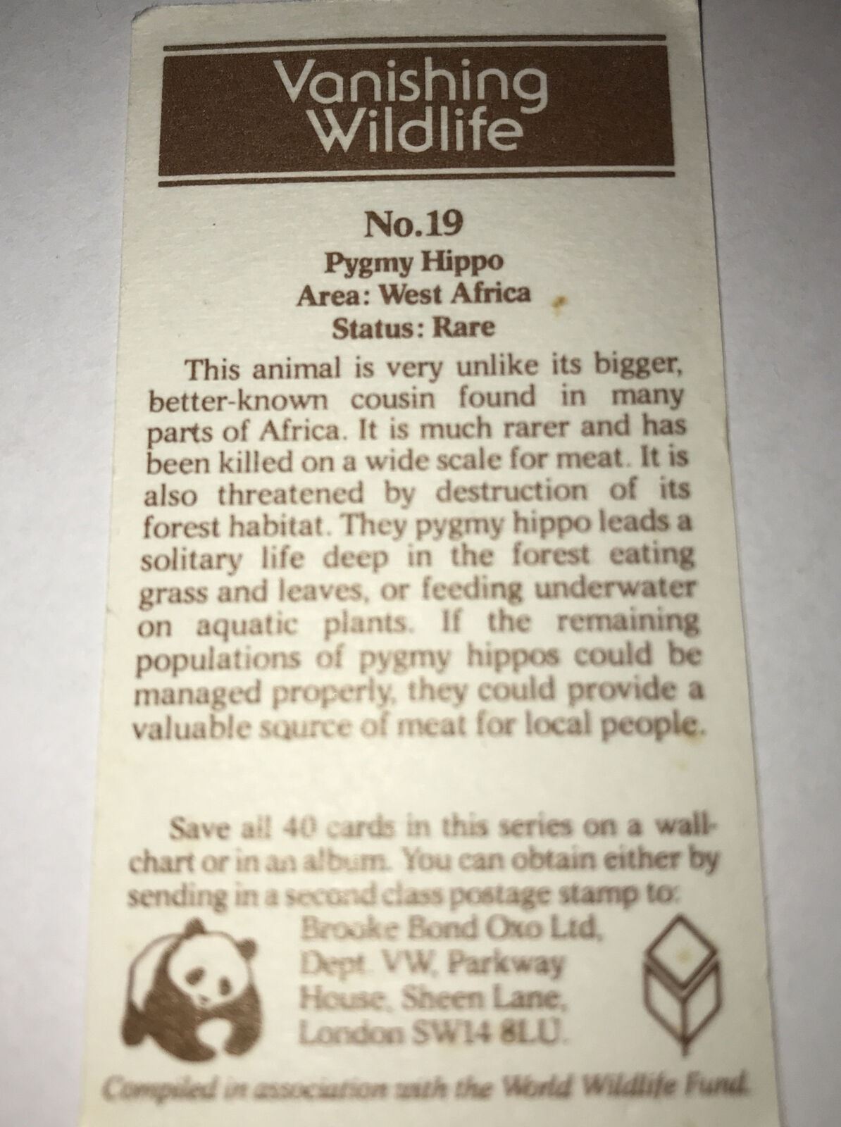 Brooke Bond Tea Card Vanishing Wildlife 19 Pygmy Hippo WWF. Condition is "Used". Dispatched with Royal Mail 2nd Class Letter.