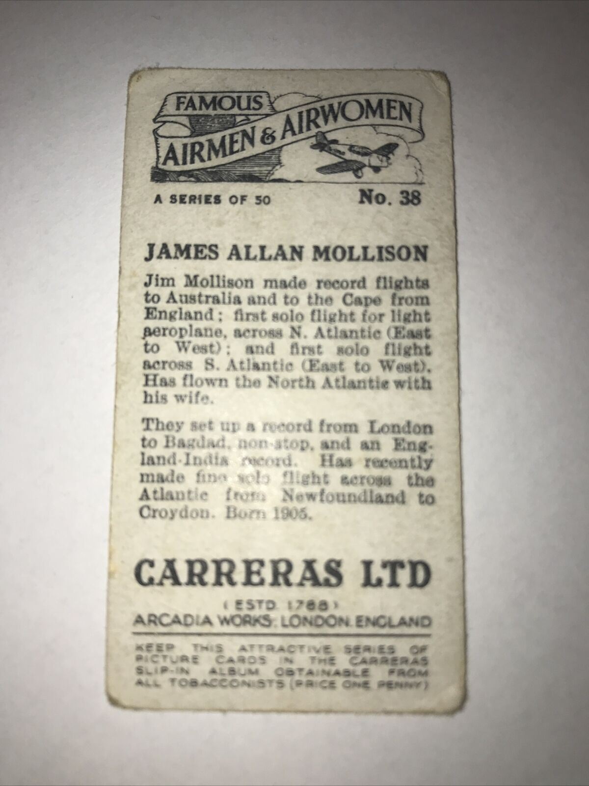 Carreras Cigarette Card Famous Airmen & Airwomen James Allan Mollison No38 Puss. Condition is "Used". Dispatched with Royal Mail 1st Class Letter.