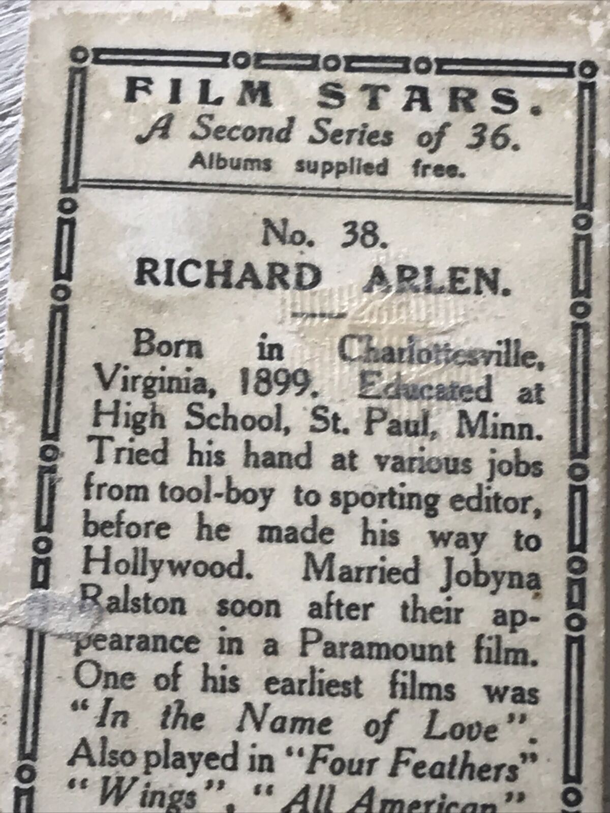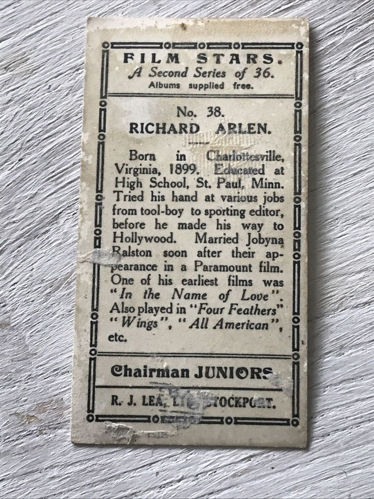 Chairman Juniors Cigarette Card Film Stars 38 Richard Arlen Hollywood Wings