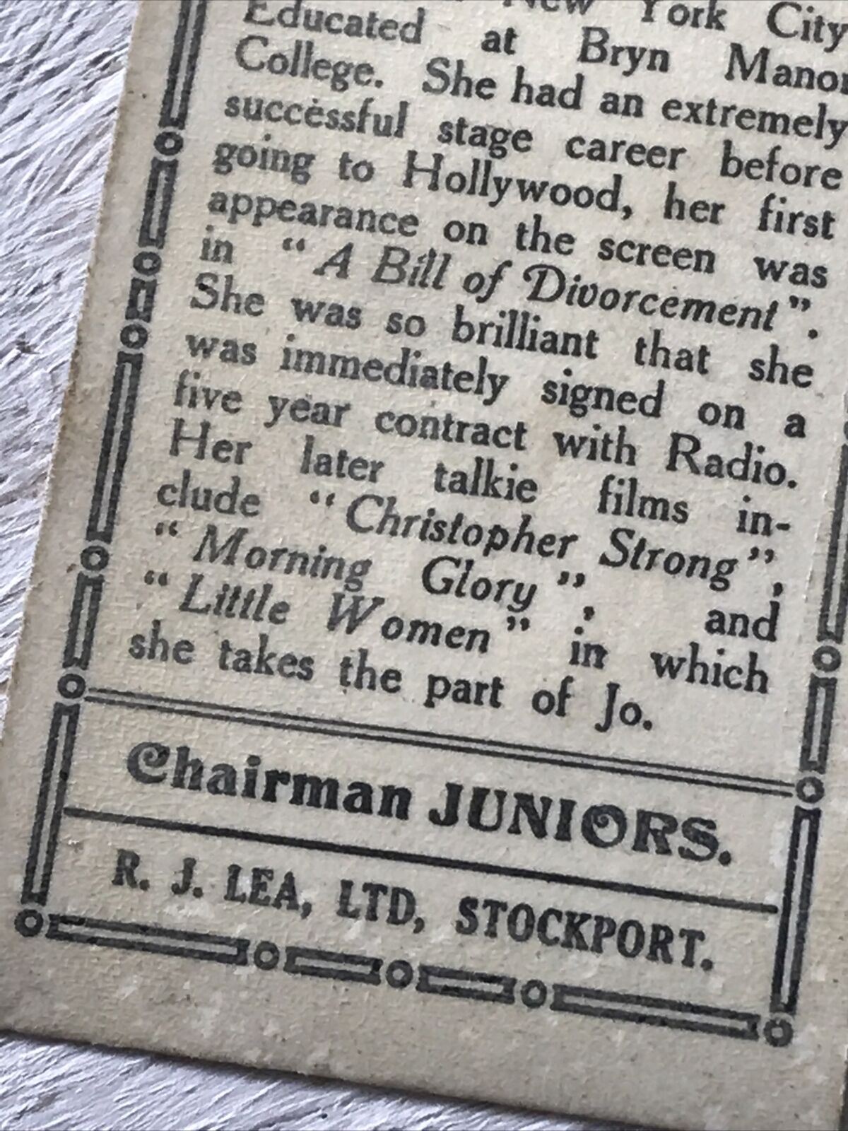 This collectible item is the perfect addition to any fan's movie memorabilia collection. This Chairman Juniors Cigarette Card features Katherine Hepburn in a stylish portrait. A unique and rare item, it's ideal for any Hepburn fan.