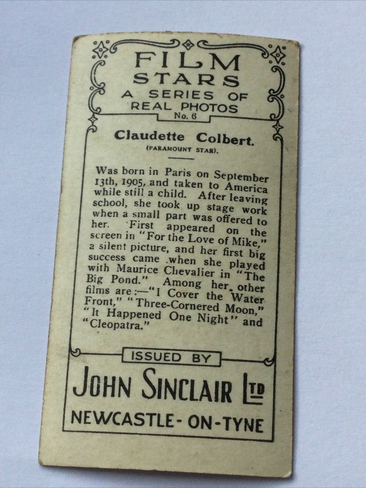 CLAUDETTE COLBERT Photo - John Sinclair Cigarette Card - Film Stars - #6 - Actress - 'The Big Pond'