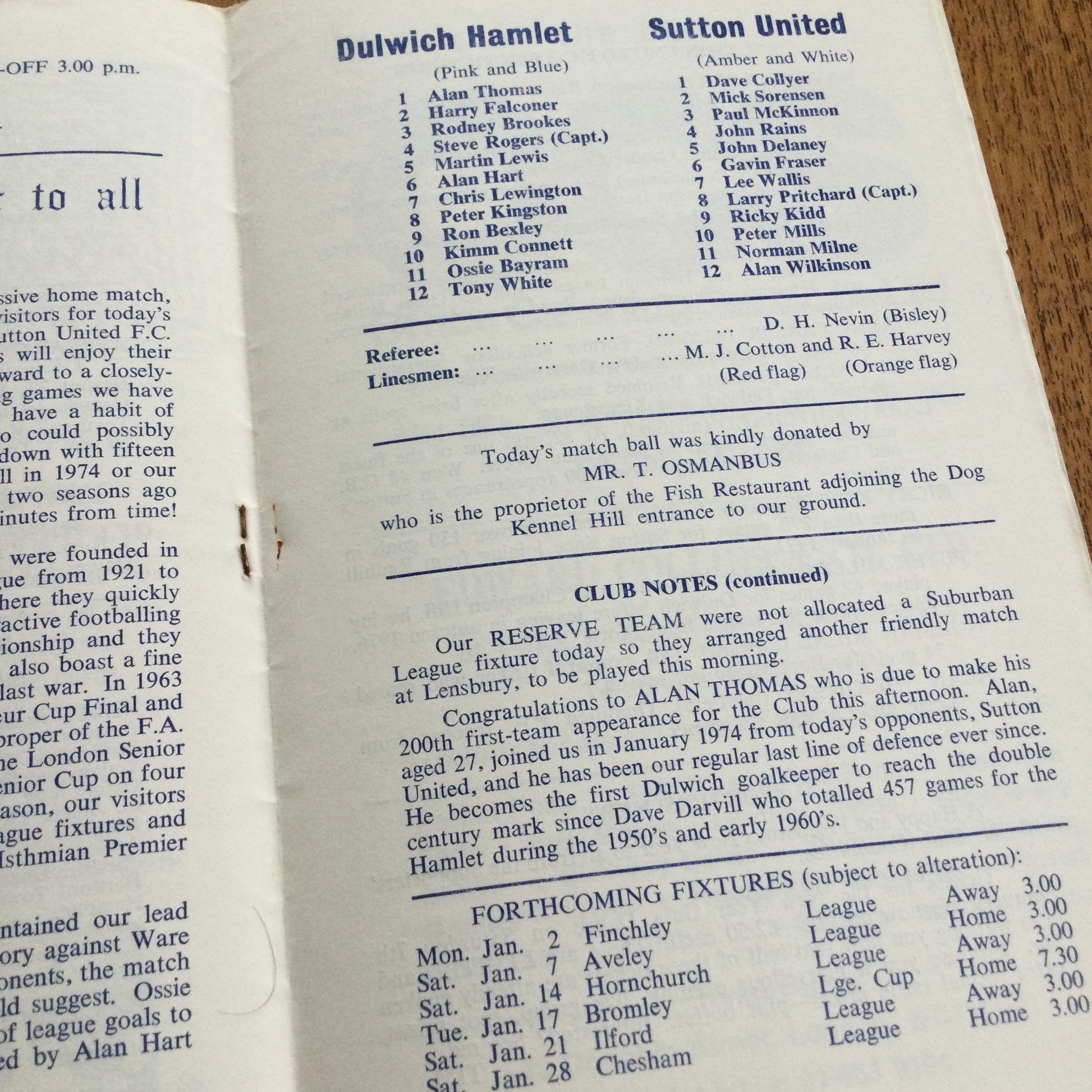 Dulwich Hamlet v Sutton Utd. Surrey Senior Cup - 1st Round. 31/12/77 1977/78 Programme.