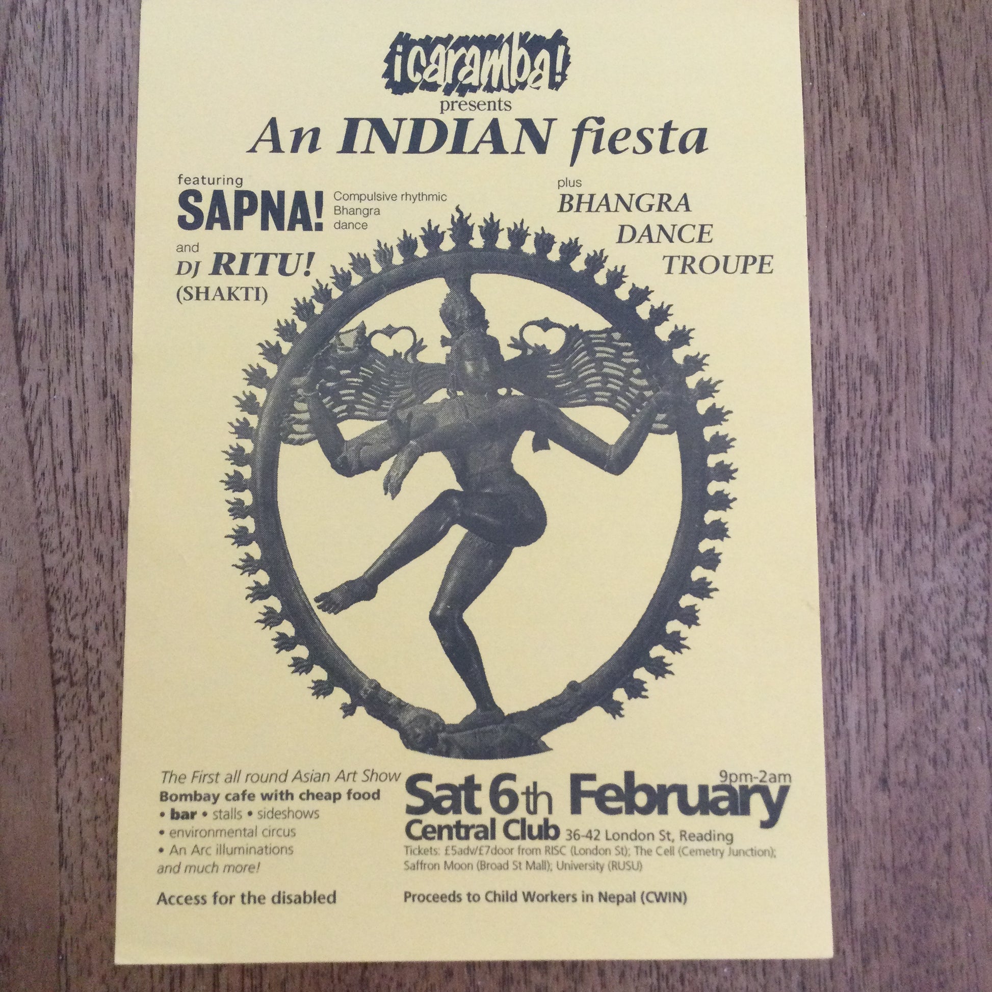 Caramba! Reading World Music Scene Memorabilia. 1990s 90s A5 Flyer Indian Fiesta Sapna! Bhangra
