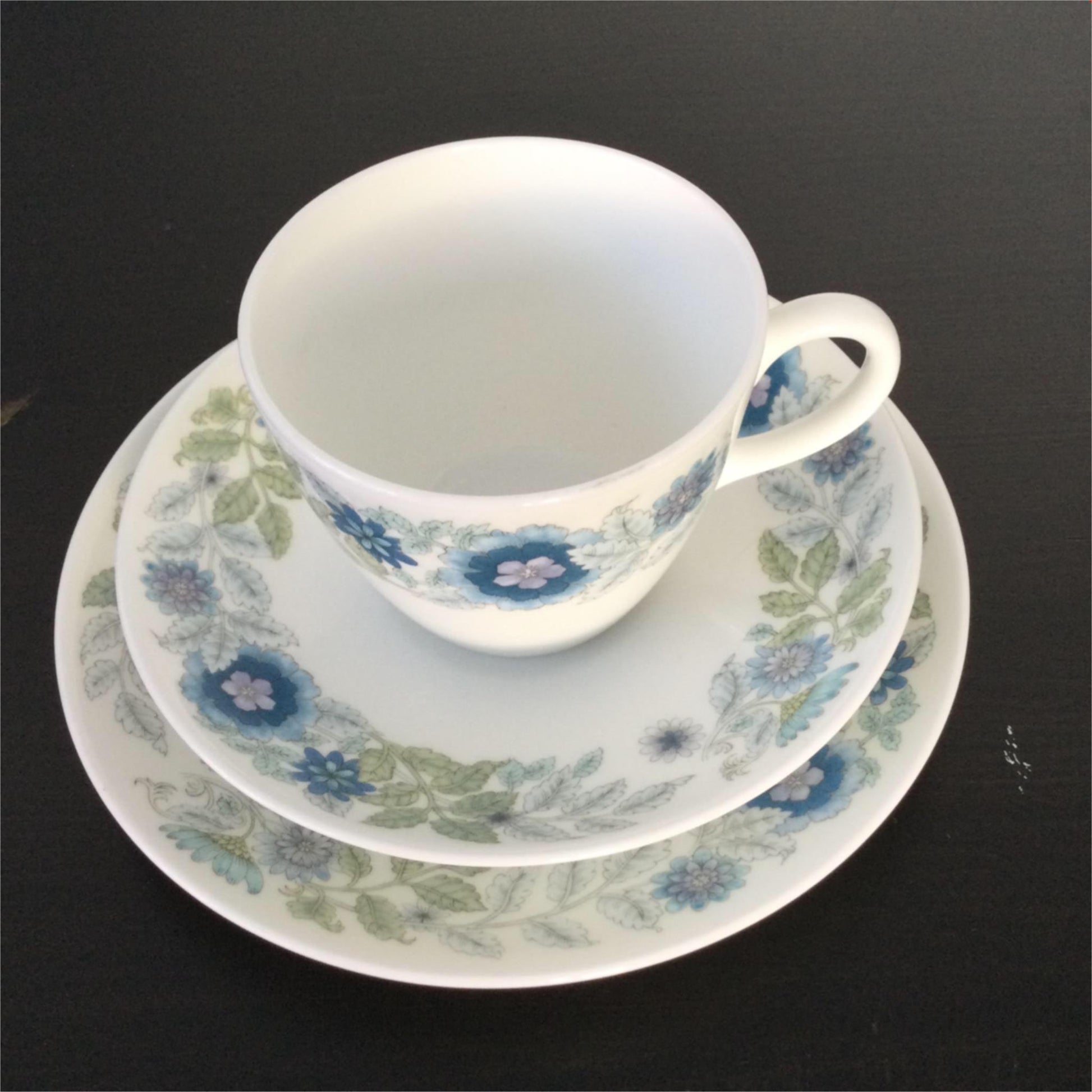 Tea Cup, Saucer & Plate trio 1970s 1980s Wedgwood Clementine blue white lilac green