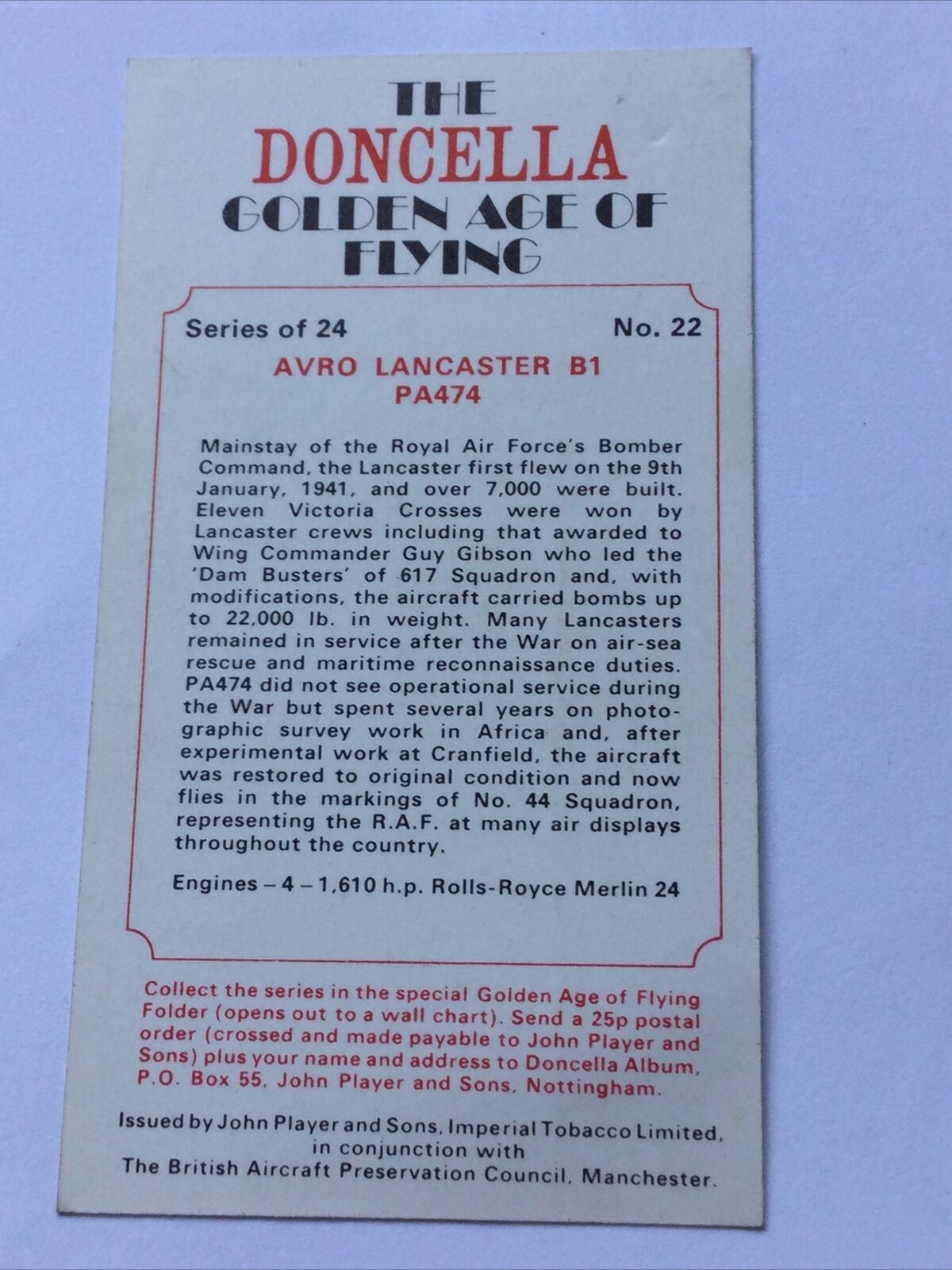 DONCELLA PLAYERS CIGARETTE CARD AVRO LANCASTER B1 PA474 Golden Age Of Flying