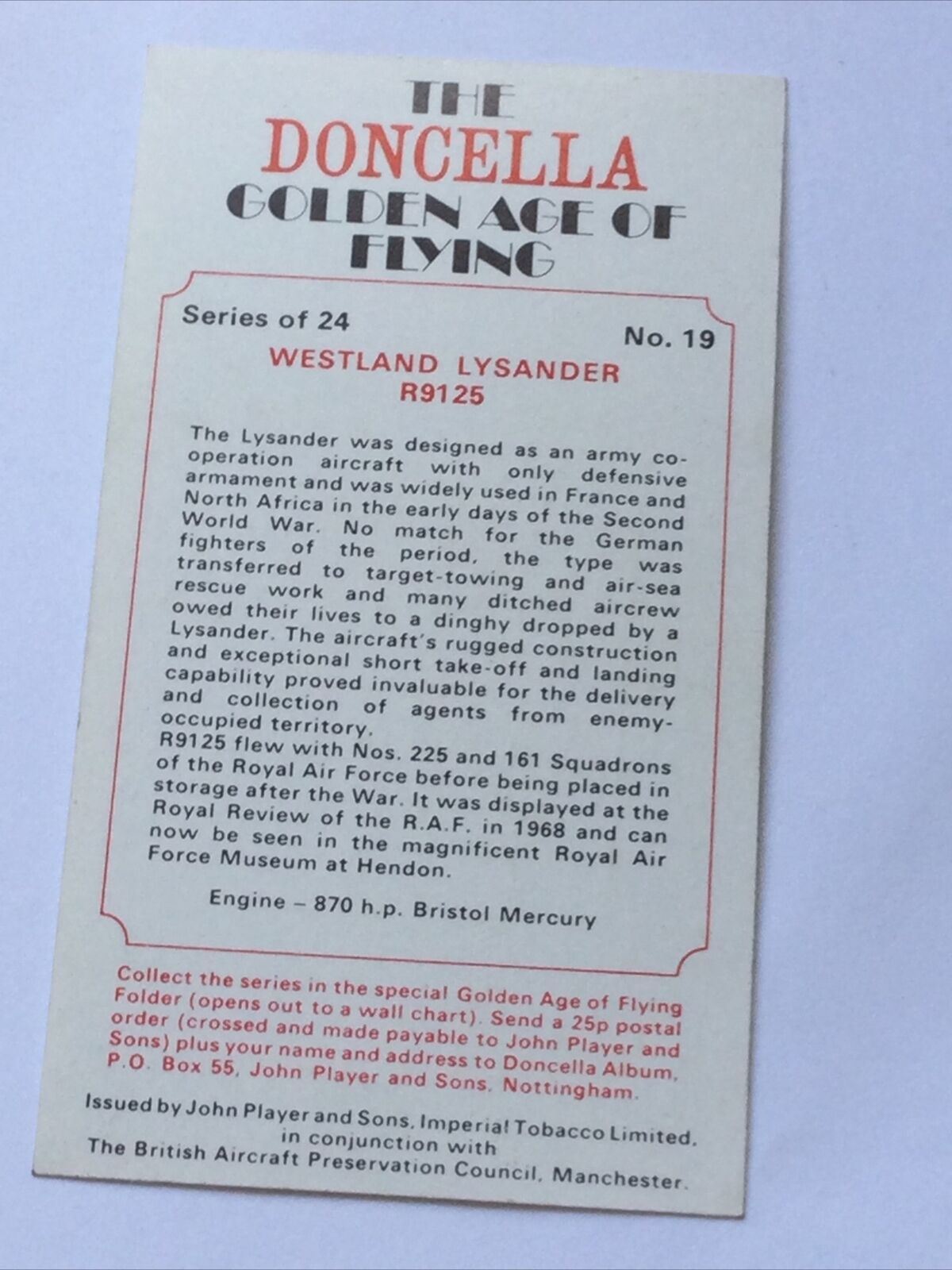 DONCELLA Players CIGARETTE CARD Westland Lysander R9125 Golden Age Of Flying