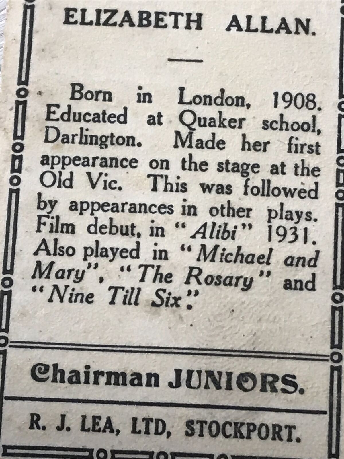 ELIZABETH ALLAN Chairman Juniors Cigarette Card Film Stars 37 Old Vic Alibi