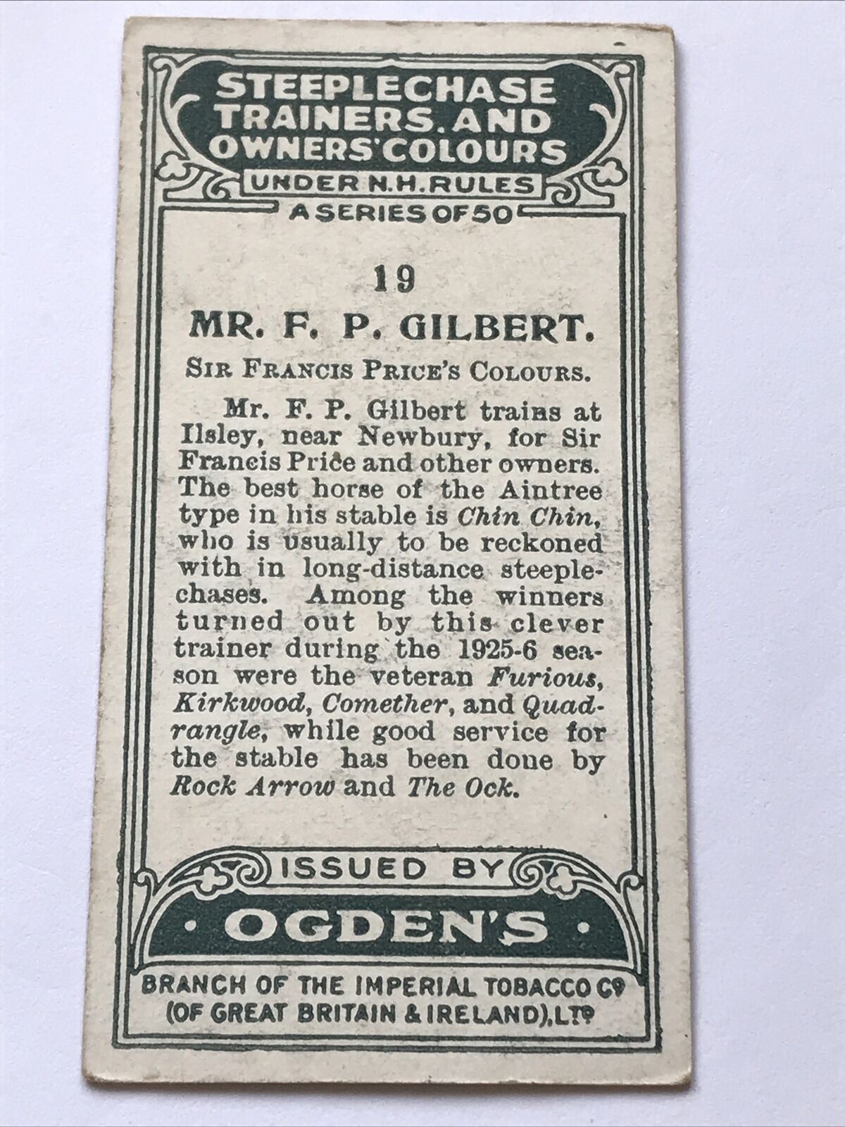 F P GILBERT FRANCIS PRICE OGDENS #19 Steeplechase Trainers & Owners Colours OCK