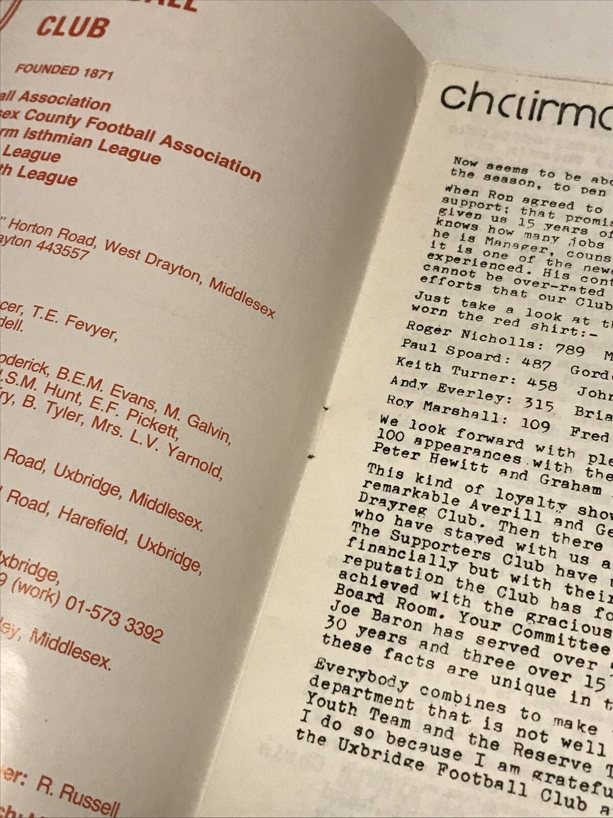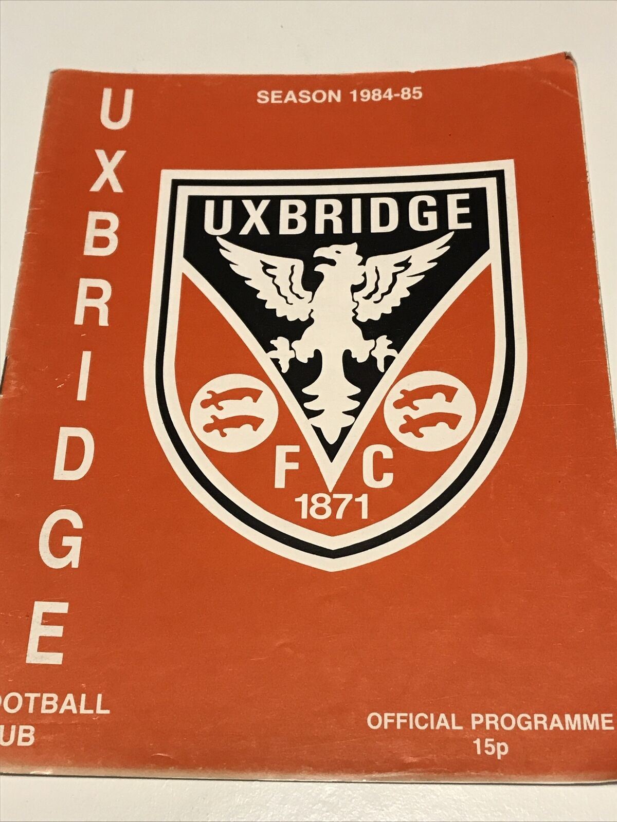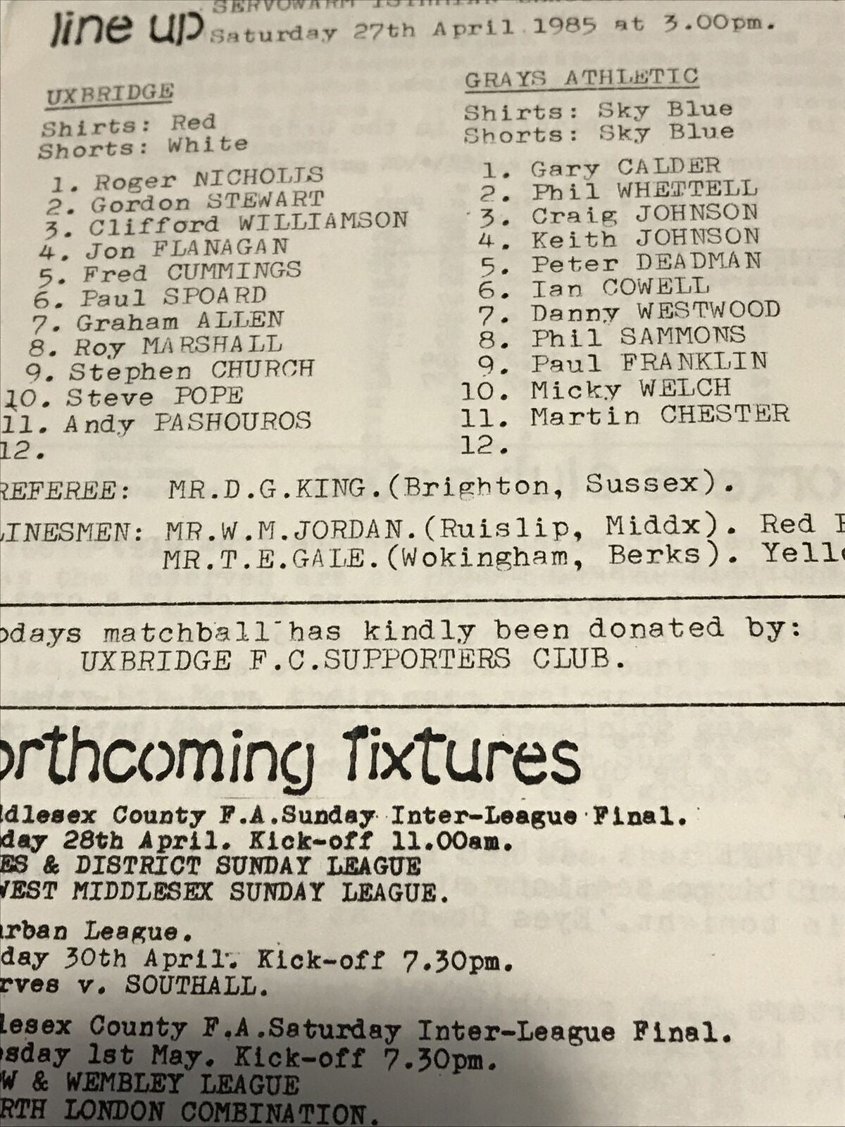 Football Programme Vintage 80s UXBRIDGE V GRAYS ATHLETIC April 1985 JON FLANAGAN