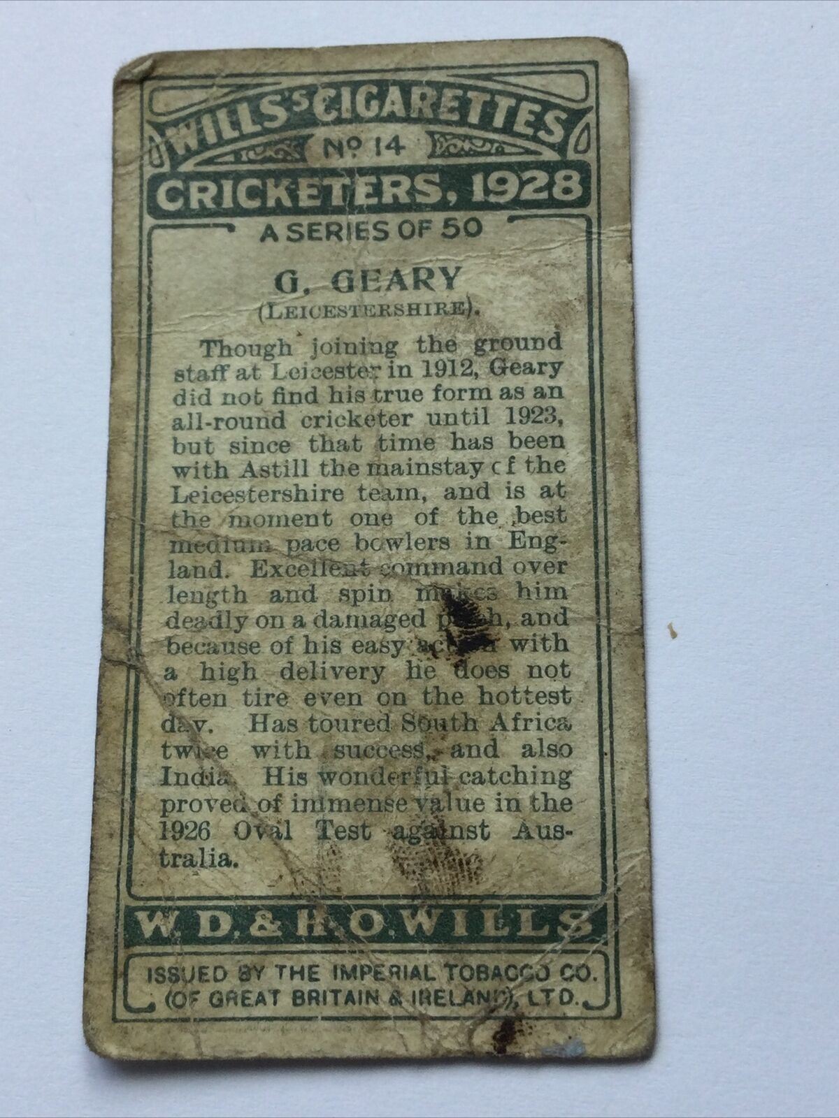 G Geary Leicestershire WILLS CIGARETTE CARD Cricketers #14