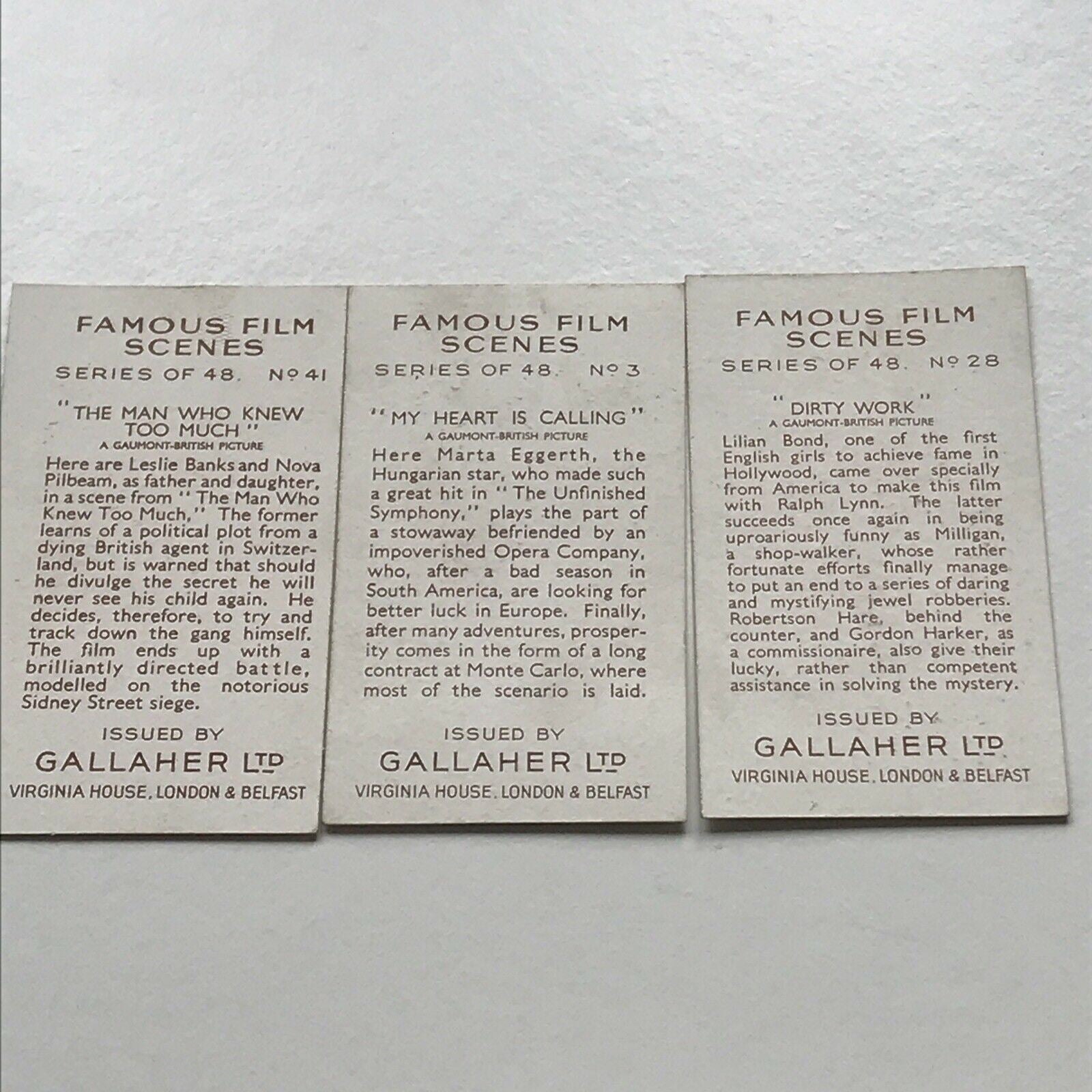 GAUMONT-BRITISH FILM MEMORABILIA. 3 x Cigarette Cards Gallaher 3 28 41 Famous film scenes