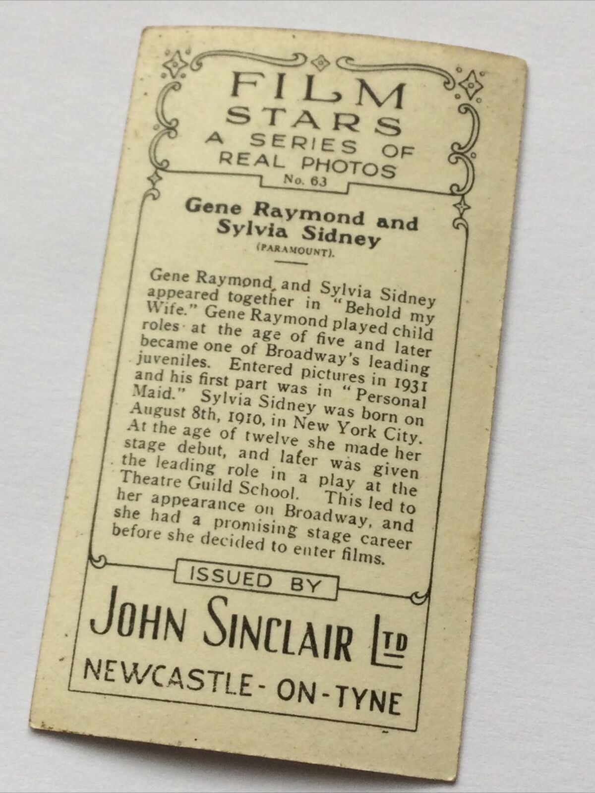 GENE RAYMOND SYLVIA SIDNEY Photo - John Sinclair Cigarette Card Film Stars #63
