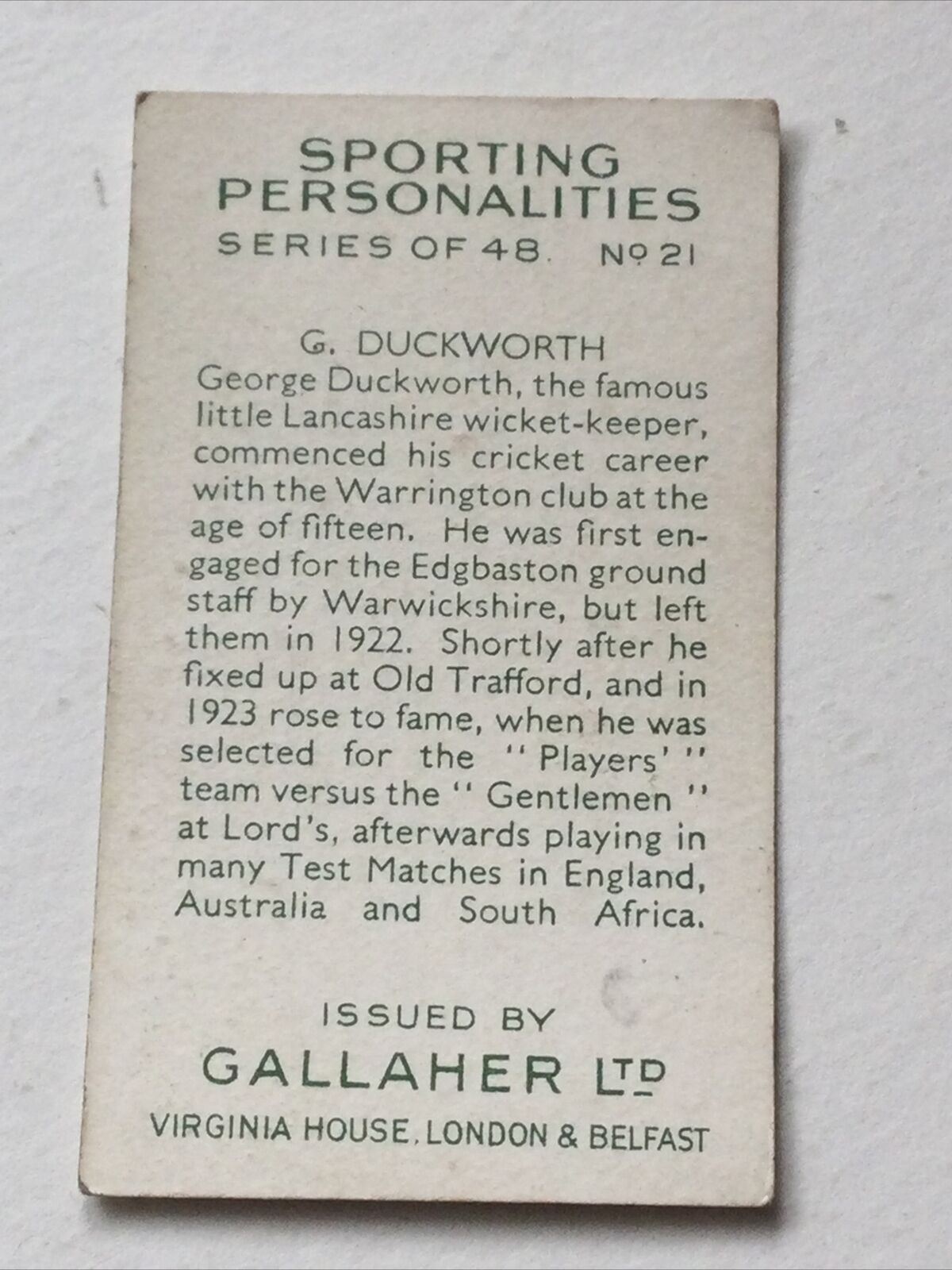 GEORGE DUCKWORTH Gallaher cigarette Card Sporting Personalities #21 Cricket