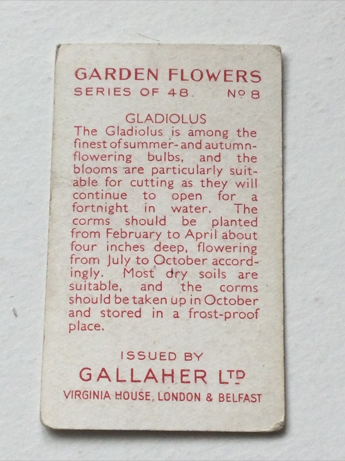 GLADIOLUS Gallaher cigarette Card Garden Flowers #8/48 Pretty Print Vintage