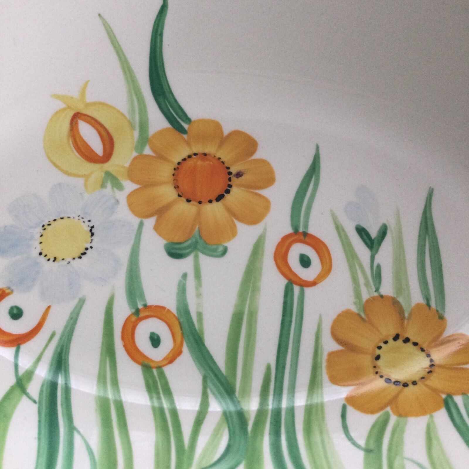 Decorated in large hand painted flowers in beautiful bright colours - orange, blue, yellow, with green leaves and grasses.