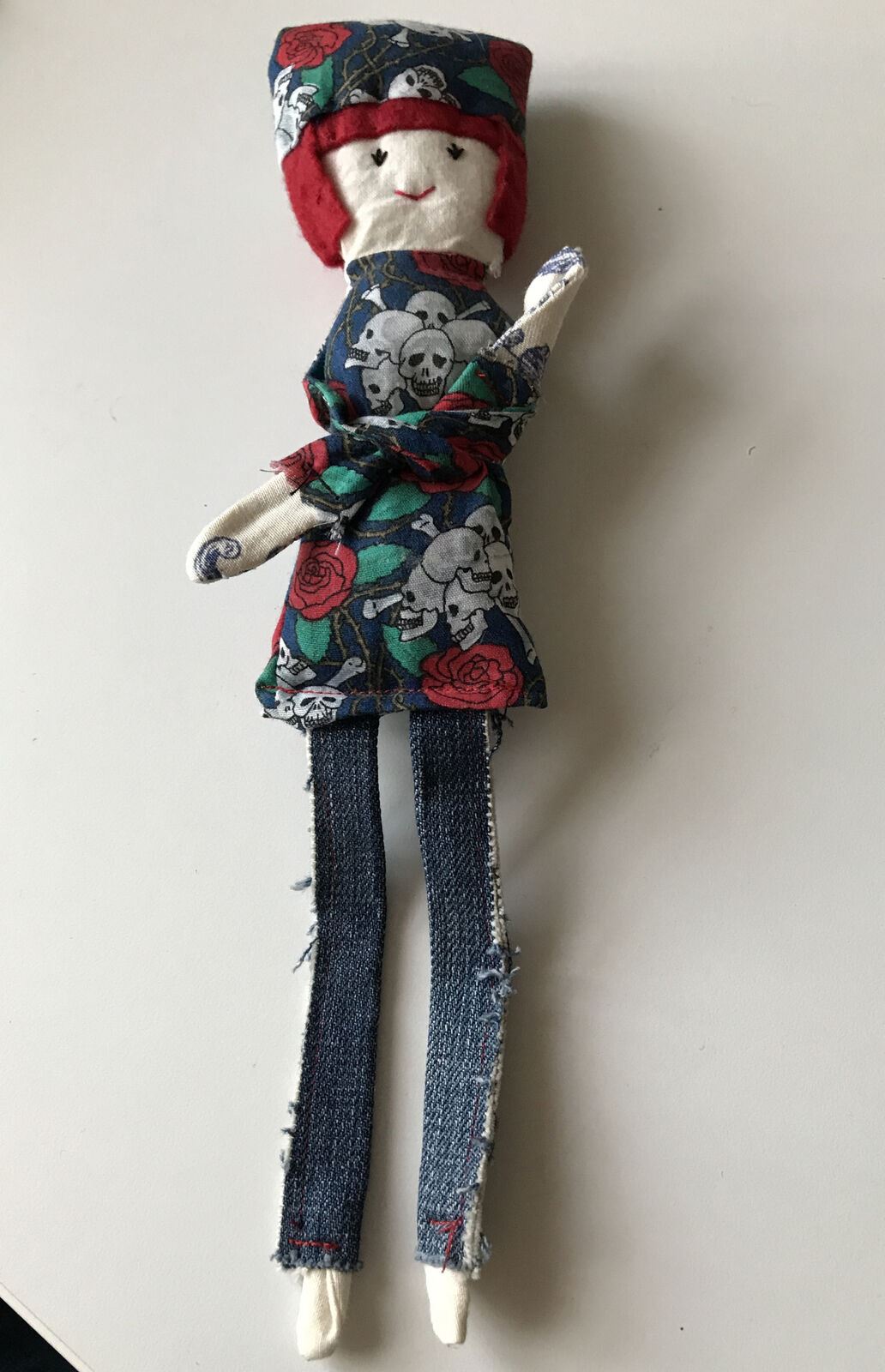 Hand Made Rag Doll. 1950s Tattooed Lady. Rockabilly Denim Retro Alternative Skulls. 30 cm