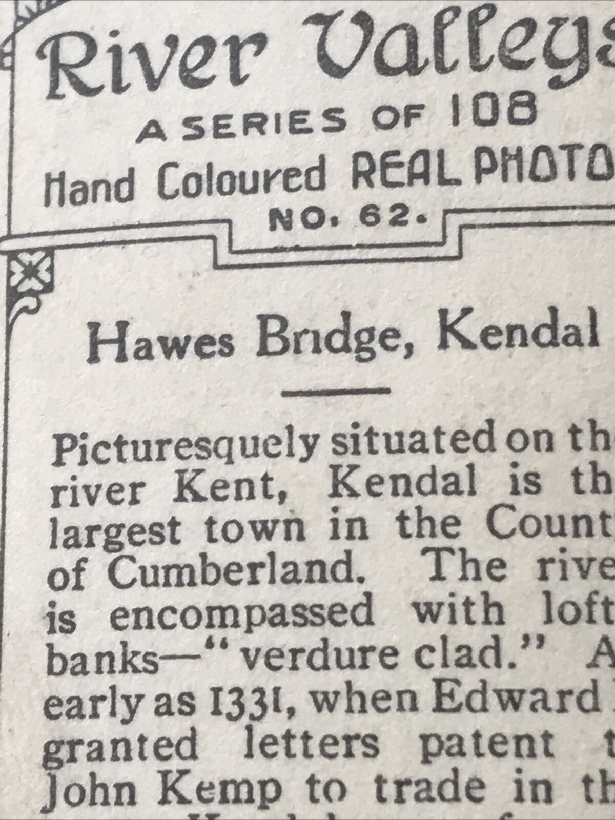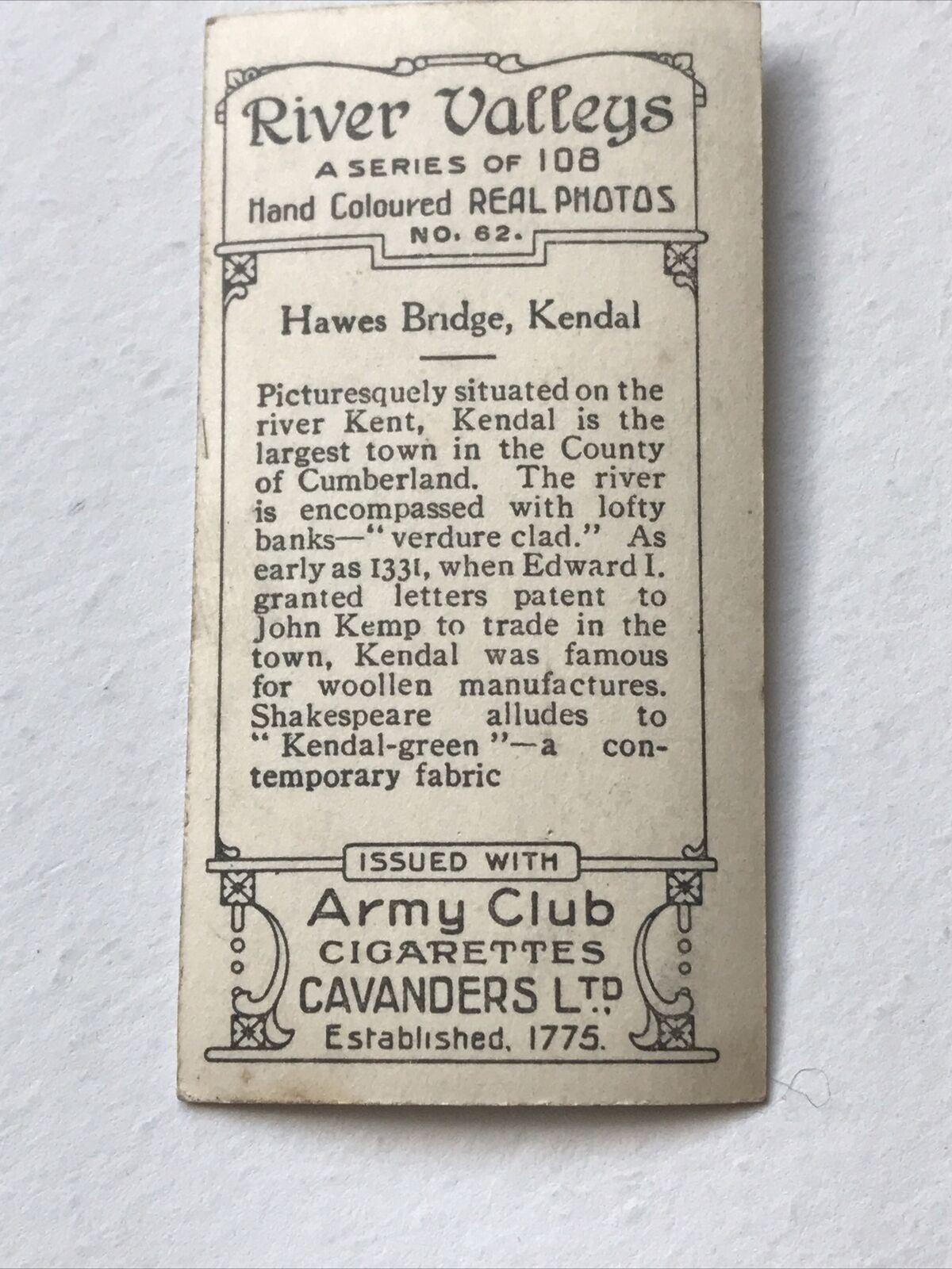 Cavanders Cigarette Card - River Valleys - No. 62 - HAWES BRIDGE KENDAL - Tinted Photo - 1926