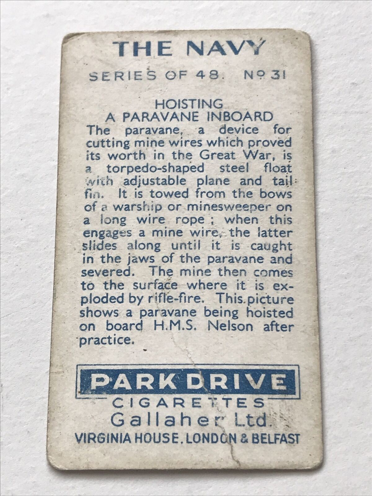 HOISTING A PARAVANE INBOARD Park Drive Cigarette Card The Navy No.31 Creased. Condition is "Used". Dispatched with Royal Mail 2nd Class Letter.
