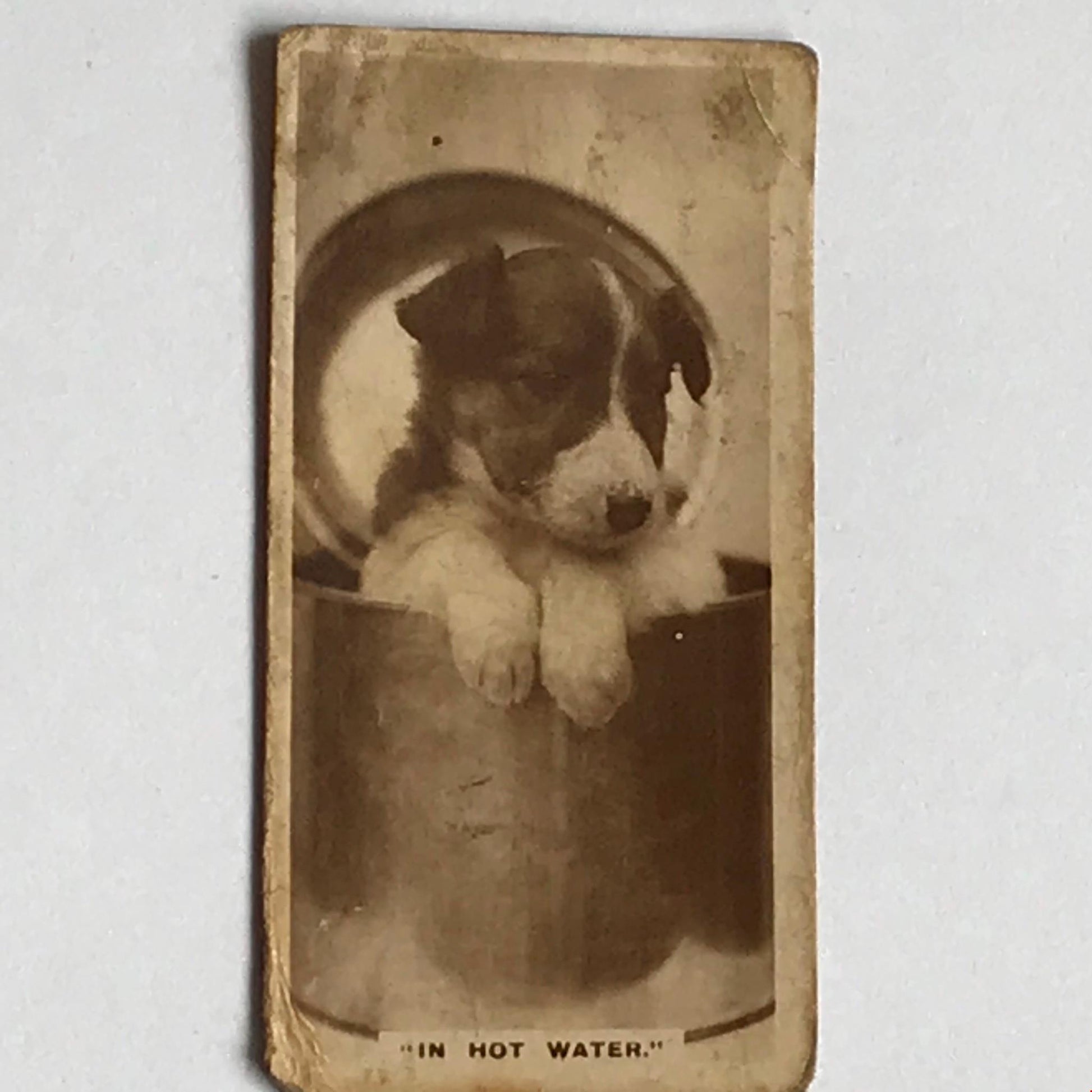 IN HOT WATER - Puppy in Pot - cute photo - De Reszke Vintage Cigarette Card - No. 6