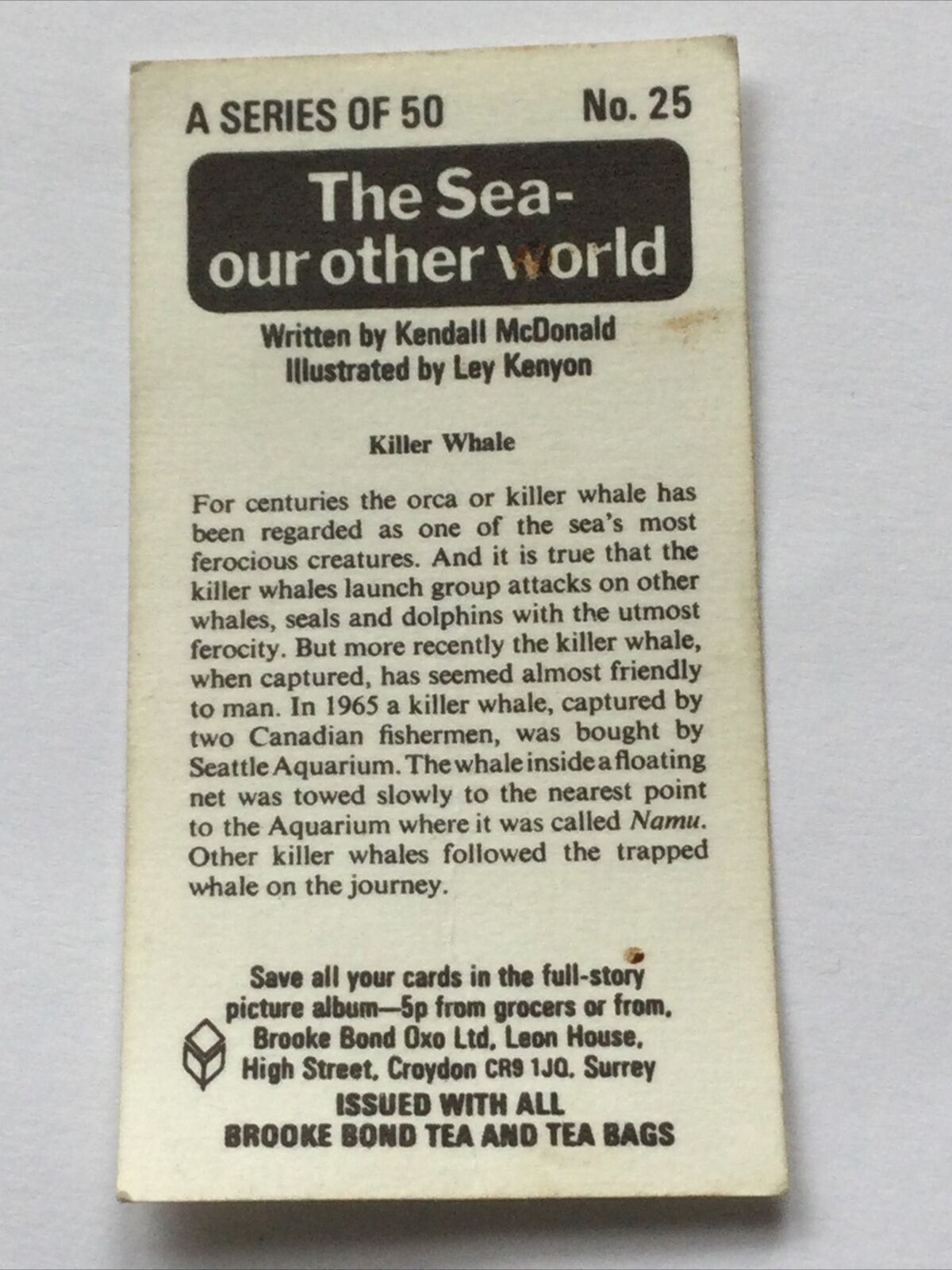 KILLER WHALE Picture Brooke Bond Tea Card The Sea - Our Other World #25 Orca. Condition is "Used". Dispatched with Royal Mail 2nd Class Letter.