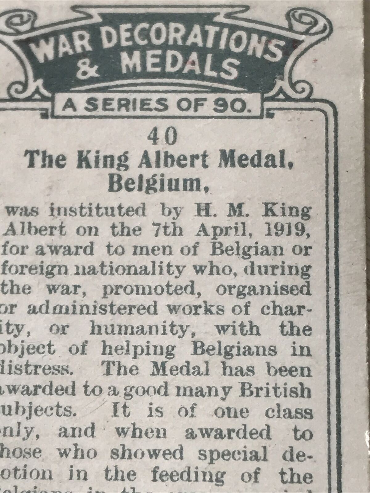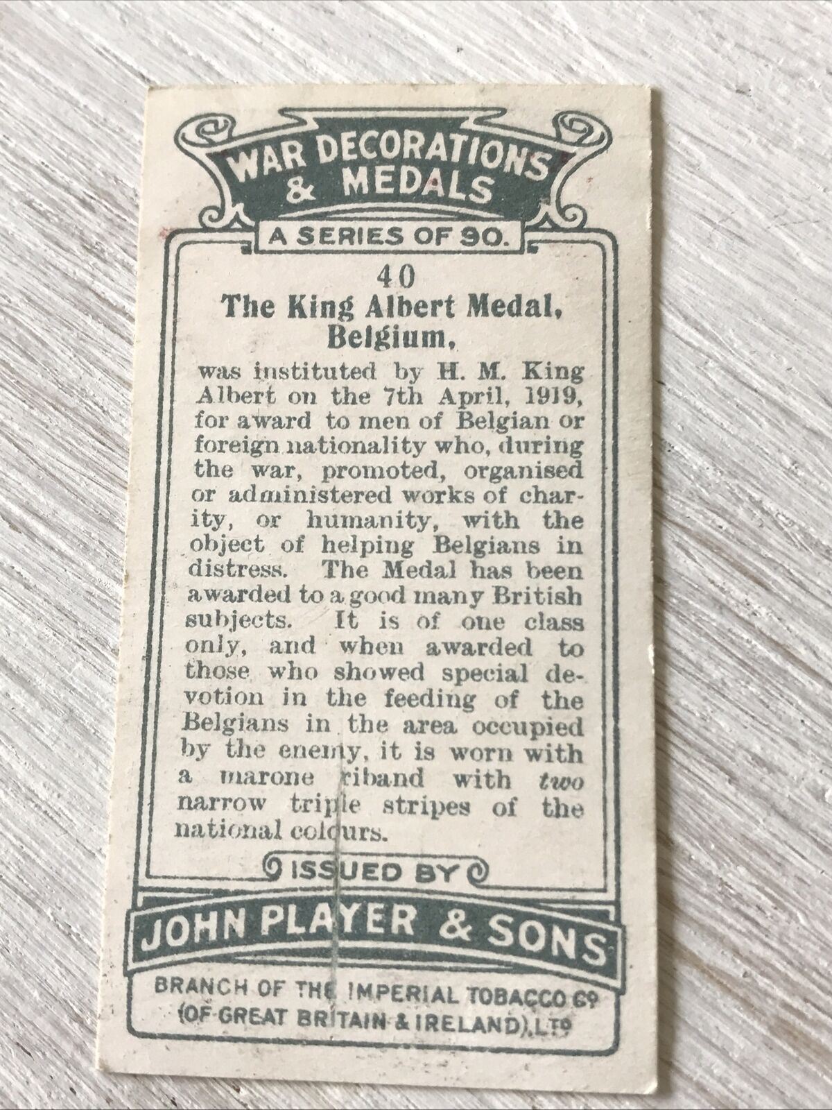 King Albert Medal Belgium Players Cigarette Card War Decorations & Medals No 40