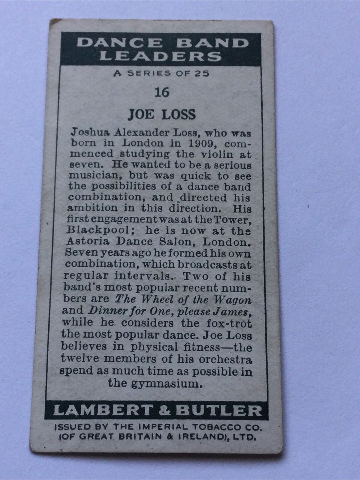 LAMBERT & BUTLER CIGARETTE CARDS - DANCE BAND LEADERS - #16 JOE LOSS. Astoria