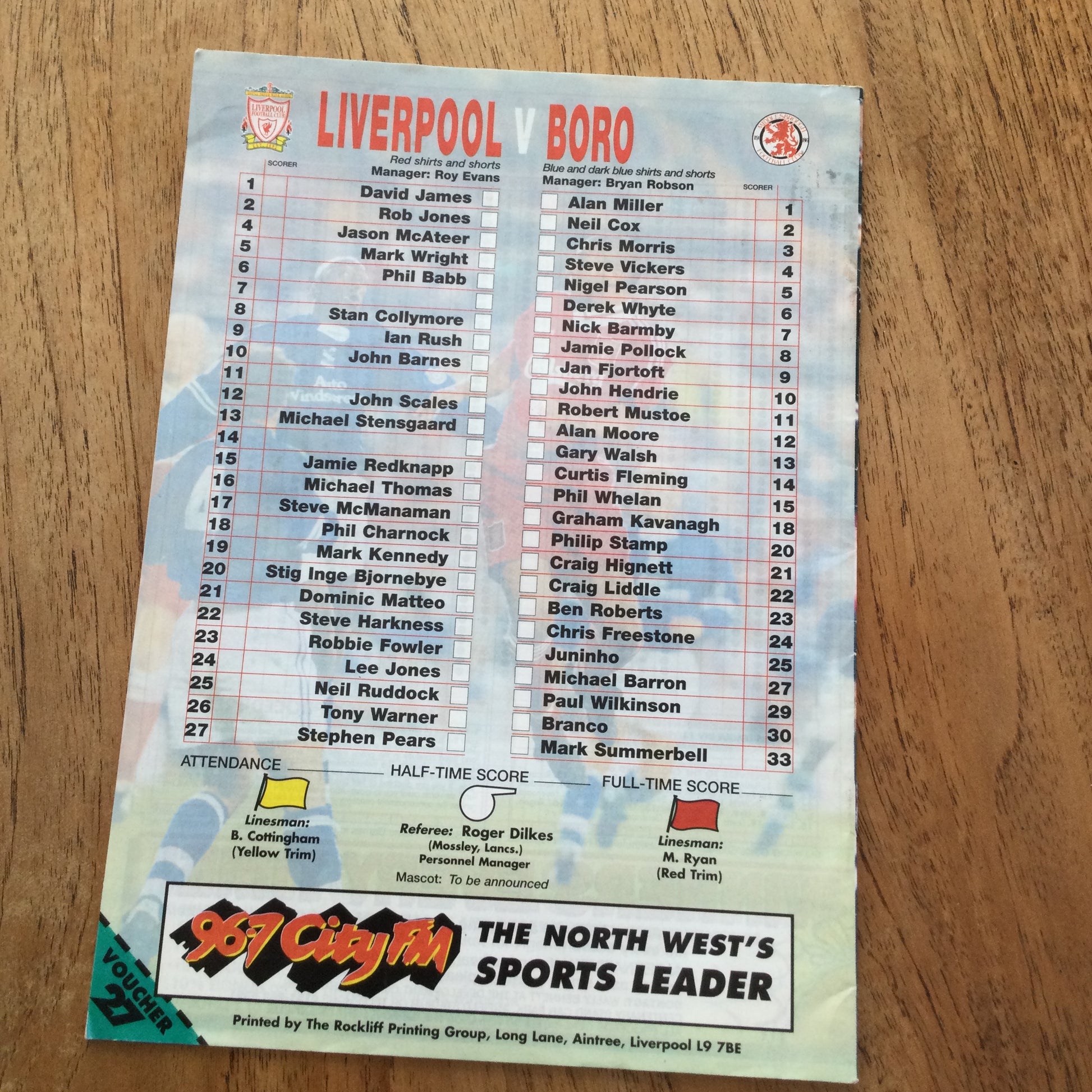 Players: David James, Rob Jones, Jason McAteer, Mark Wright, Phil Babb, Stan Collymore, Ian Rush, John Barnes, John Scales, Michael Stensgaard, Jamie Redknapp, Michael Thomas, Steve McManaman, Phil Charnock, Mark Kennedy, Stig Inge Bjornbye, Dominic Matteo, Steve Harkness, Robbie Fowler, Lee Jones, Neil Ruddock, Tony Warner, Stephen Pears.