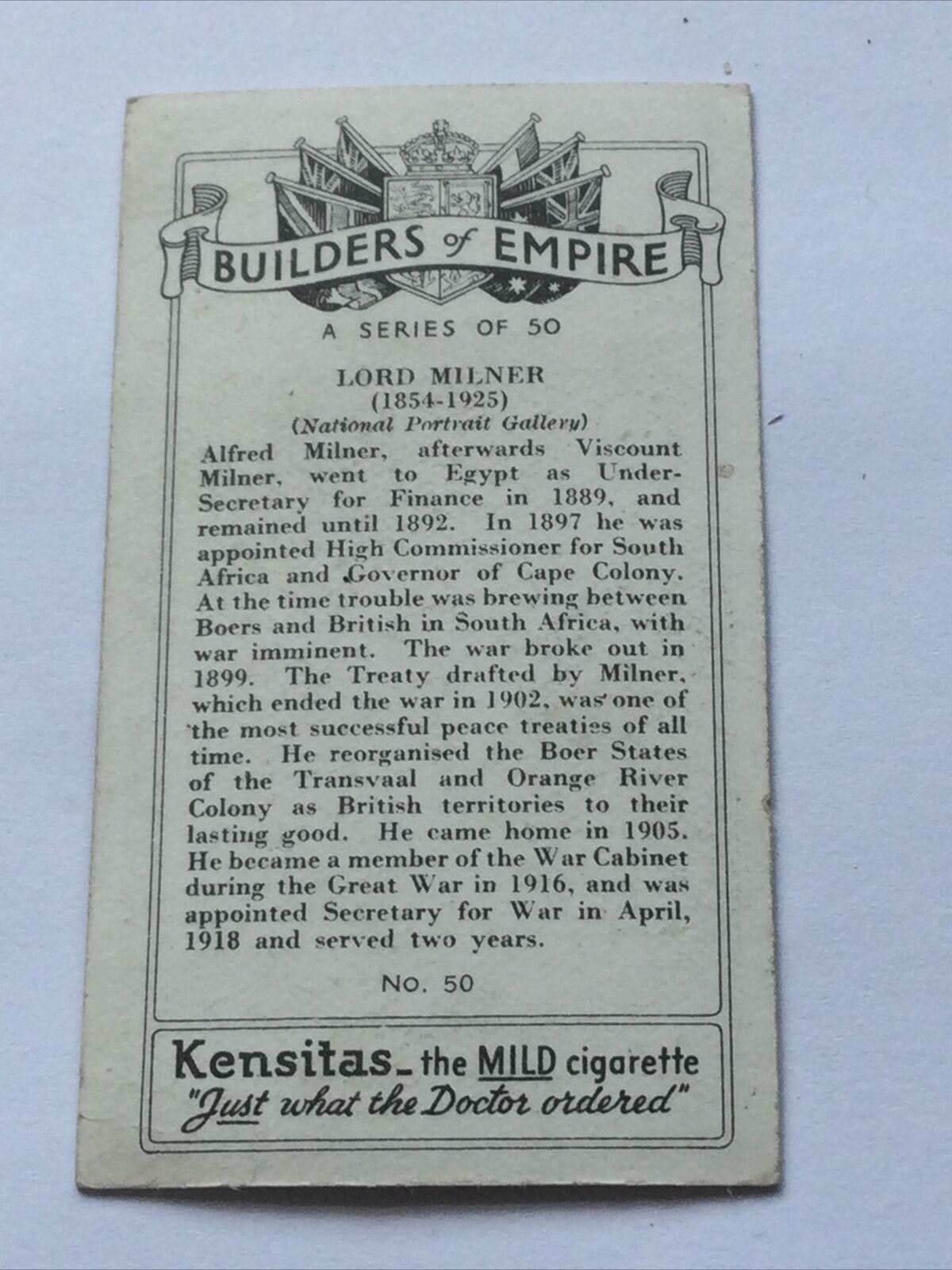 LORD MILNER Kensitas Cigarette Card Builders Of Empire #50 Secretary For War WWI
