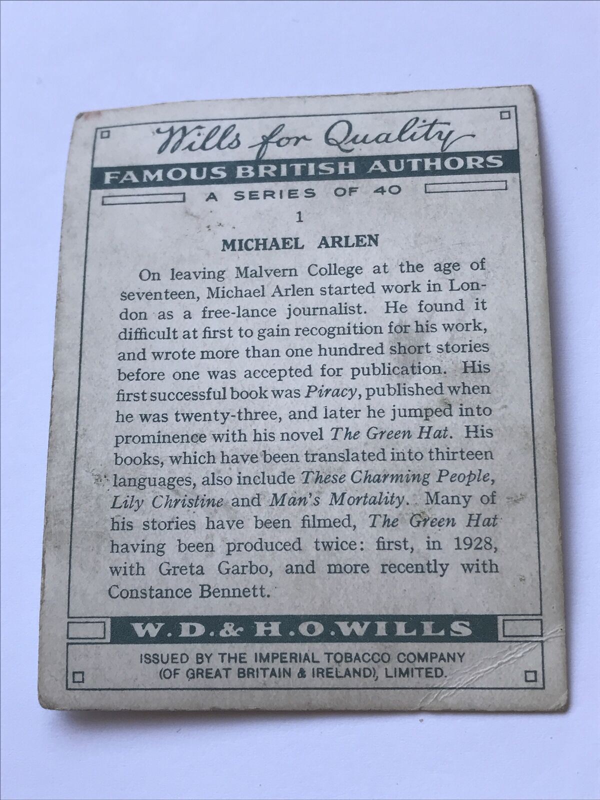 Michael Arlen WILLS CIGARETTE CARD Famous British Authors #1 The Green Hat