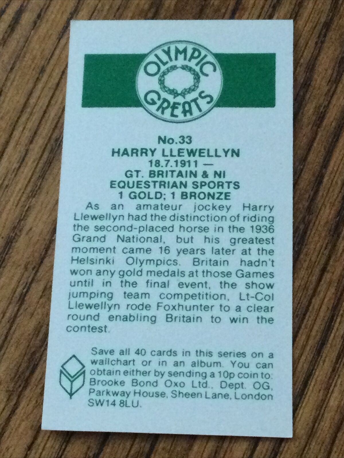 OLYMPICS HARRY LLEWELLYN Brooke Bond Tea Card Olympic Greats #33 Equestrian