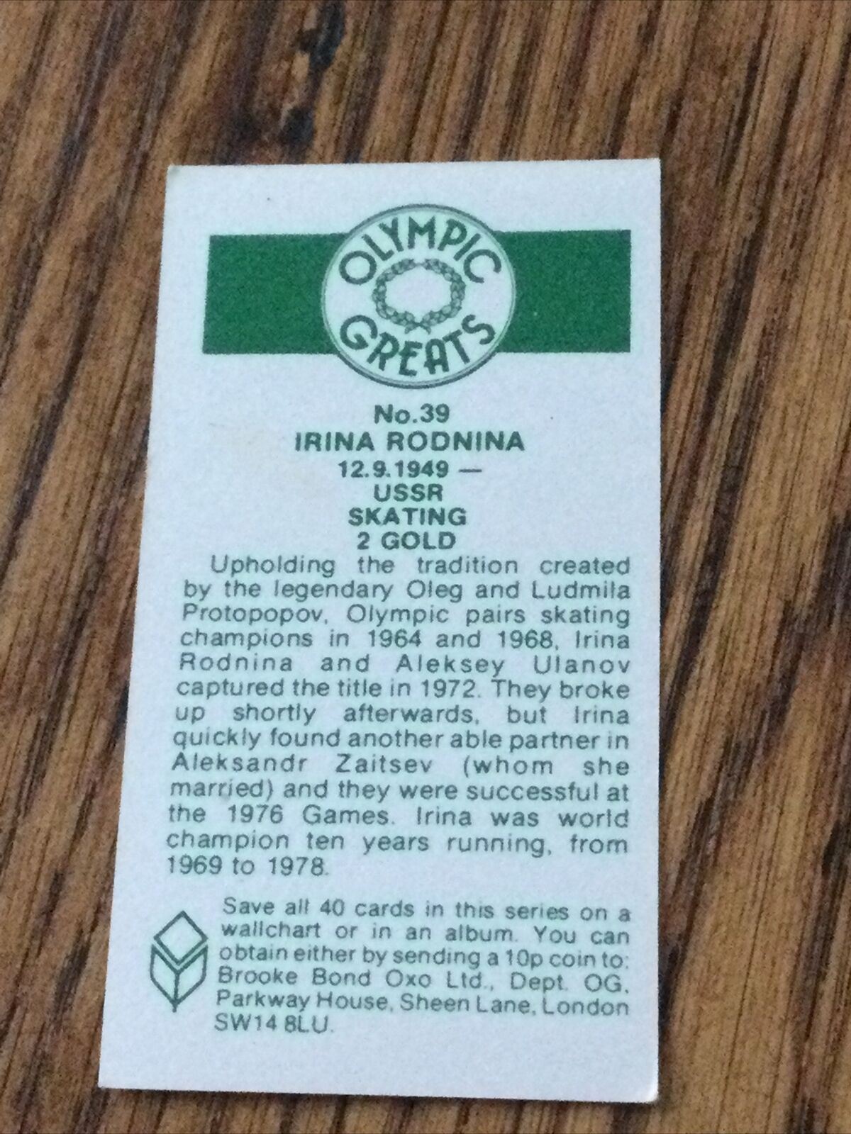 OLYMPICS IRINA RODNINA Brooke Bond Tea Card Olympic Greats #39 Skating USSR GOLD