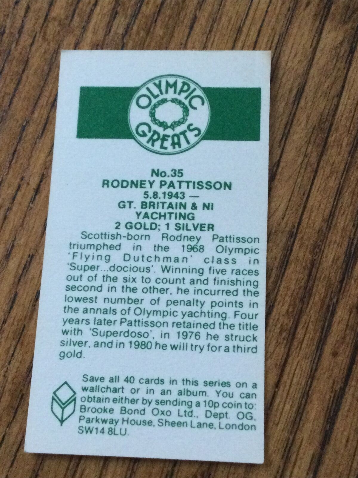 OLYMPICS RODNEY PATTISSON Brooke Bond Tea Card Olympic Greats #35 YACHTING GOLD