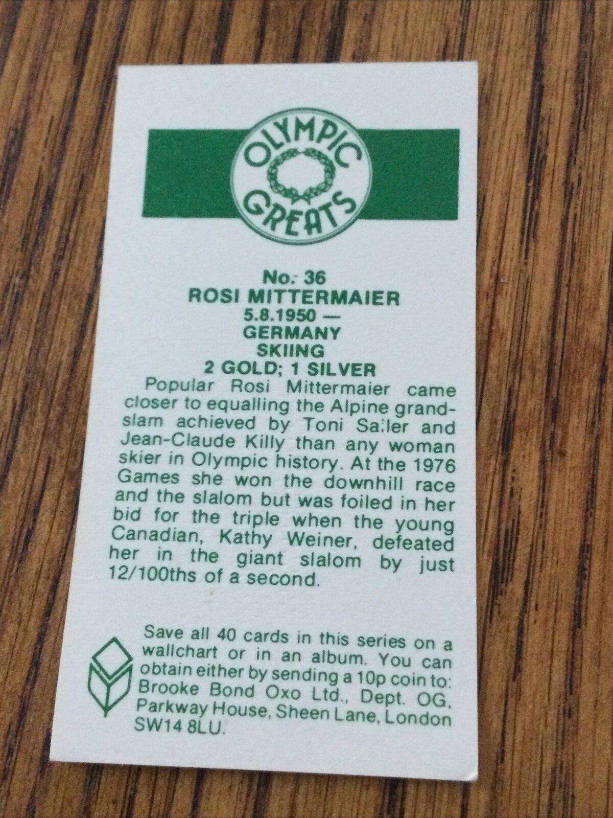 OLYMPICS ROSI MITTERMAIER Brooke Bond Tea Card Olympic Greats #36 SKIING GERMANY